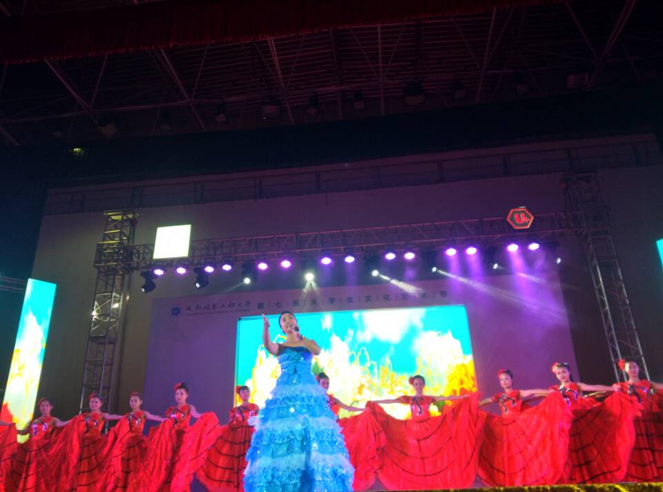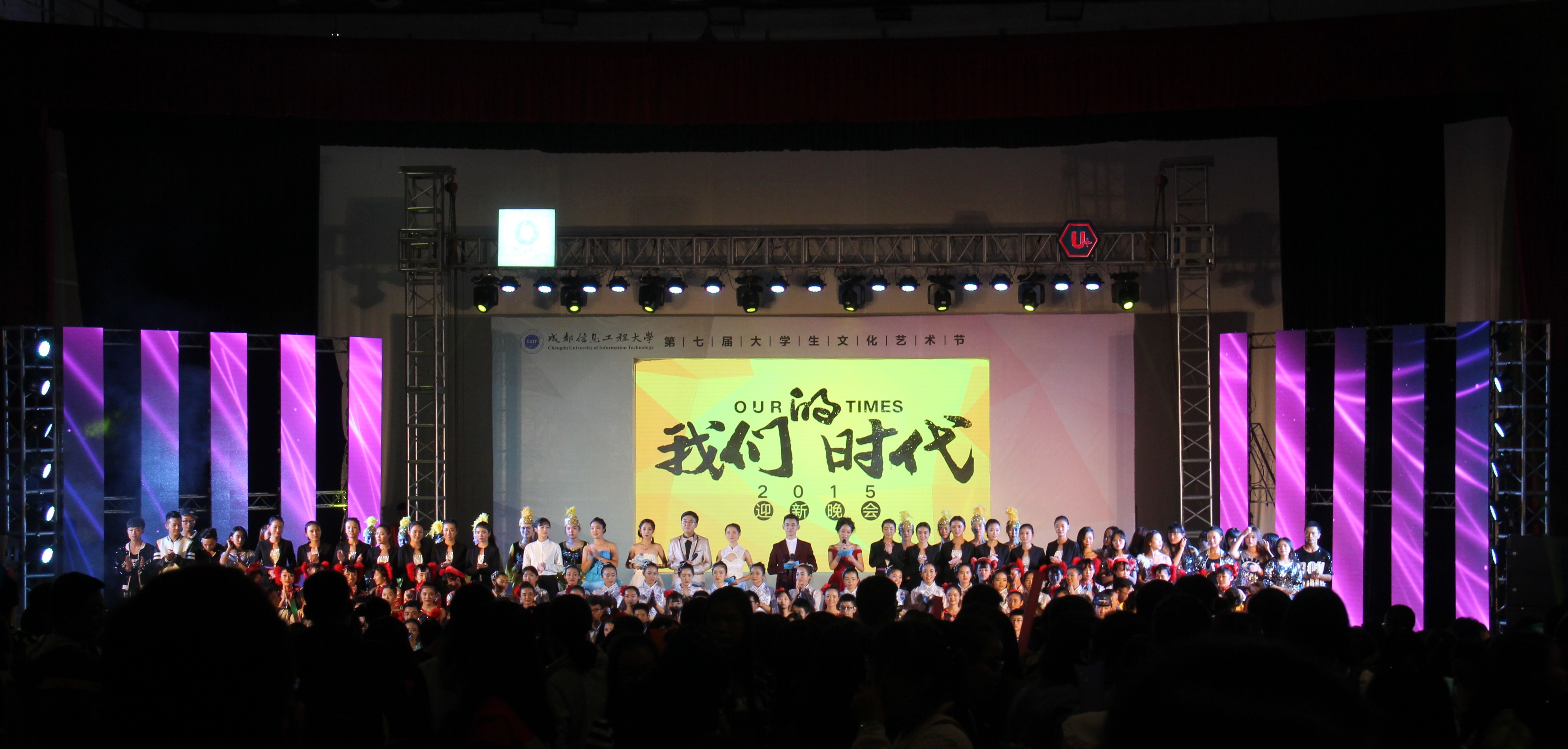 航空港校区迎新晚会特邀金池、李祥祥、王啸坤三位明星嘉宾到场倾情献唱,他们用美妙的歌声表达了对成信师生的美好祝福,台下观众被歌手们动听的歌声打动,情不自禁地打开手机灯随着歌声摆动,现场变成一片热闹的星光海洋,此起彼伏的掌声与欢呼声将晚会推向高潮。大气的舞台、绚烂的灯光、震撼的音乐让人心情随之澎湃,整场晚会欢乐喜庆,展现了成信师生喜迎新生的欢快心情,奏响了成信学子不断创造学校美好明天的最强音。在歌曲《长白山》的动人旋律中,“我们的时代”航空港校区2015迎新生晚会划上圆满句号。