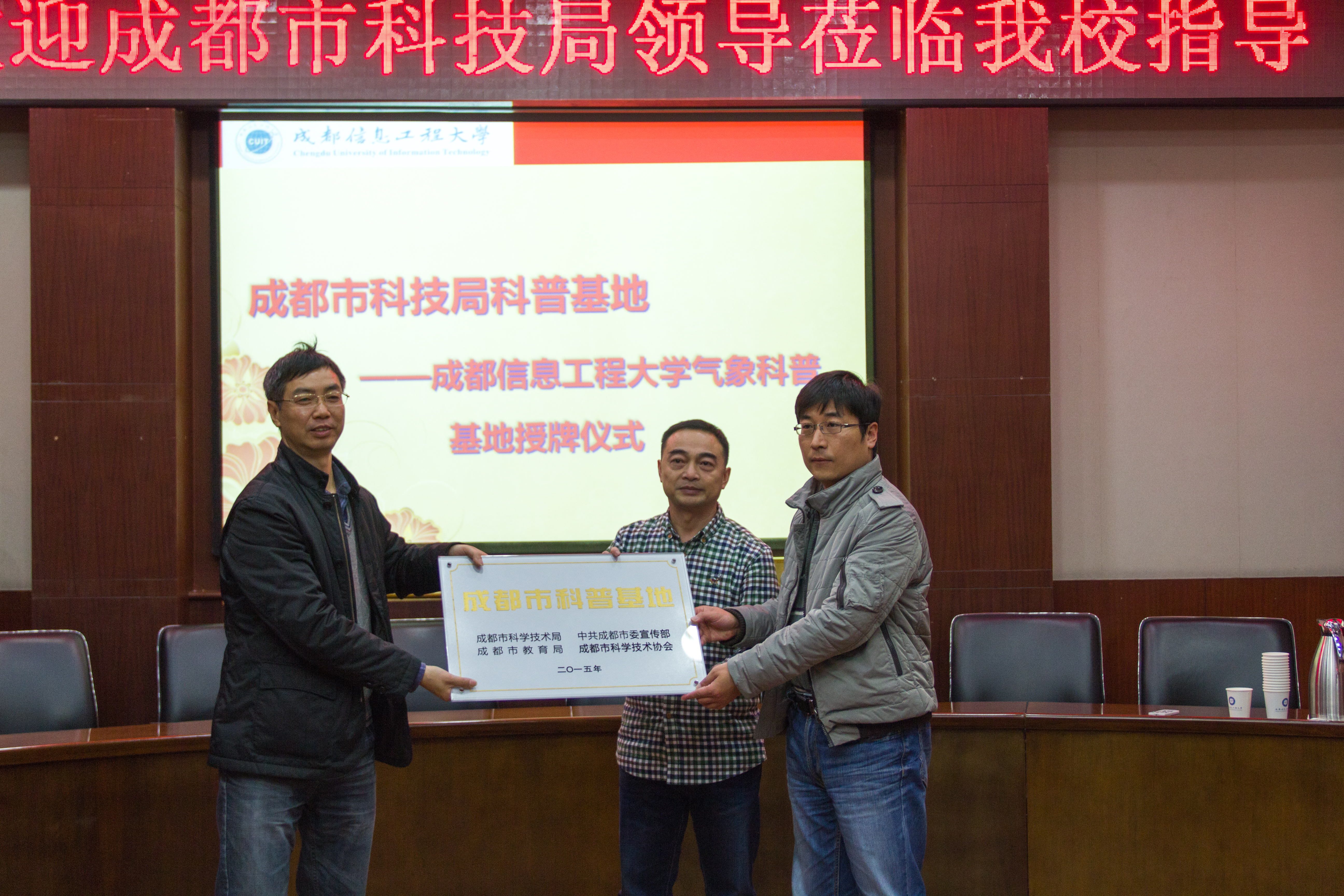 【本网讯】12月8日下午,成都市科技局社会发展处处长罗仁学、双流县科技局副局长苏一成专程率市、县科技局有关人员到乐动航空港校区,为成都市科普基地——乐动在线登录气象科普基地颁授牌。授牌仪式在六会议室举行,学校科技处、校团委负责人,校团委、电子工程学院相关负责老师、志愿者代表参加了授牌仪式。