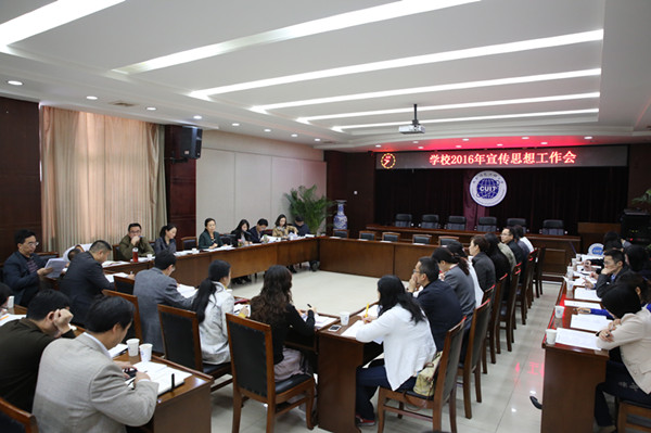 敬枫蓉指出,2016年是学校“十三五”规划的开局之年,学校的宣传思想工作的总体思路是:认真践行党管宣传、党管意识形态、党管媒体的根本原则;突出正面宣传为主的方针,扎实做好师德师风建设和师生思政工作;构建“大宣传”工作格局;围绕学校党政工作要点,以“双一流”建设等为重点精心策划内宣、外宣工作;加强网络思政建设和网络舆情监控、监管;深入推进校园文化建设,塑造具有成信特色的校园文化,加快提升学校的软实力、影响力和美誉度;加快培养造就构建一支政治坚定、素质优良、结构合理的高校宣传思想工作队伍。
