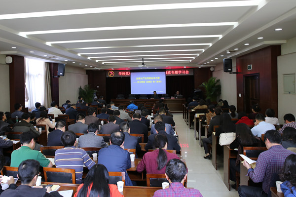 [本网讯]4月14日下午,学校在行政楼第一会议室召开“两学一做”学习教育启动会暨党委中心(扩大)组党风廉政专题学习会。会议特邀省委党校党史党建教研部主任王凡教授就学习贯彻《中国共产党廉洁自律准则》和《中国共产党纪律处分条例》(以下简称《准则》和《条例》)进行专题辅导。全体处级以上领导干部参加了会议,会议由学校党委副书记敬枫蓉主持。