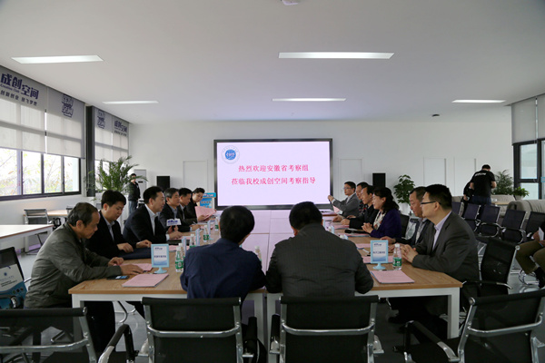 教务处实践教学管理科朱竞羽介绍了乐动创新创业教育工作的开展情况;宫冠英针对“成创空间”的孵化管理体系、服务模式、对外合作等内容向考察组进行了汇报。