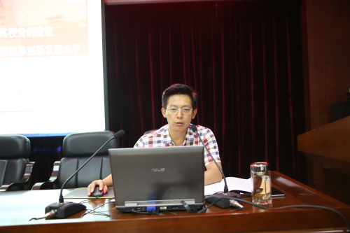 学校党委常委、党委组织部部长肖月强作题为《加强和改进高校党的建设,不断提升高校改革创新发展水平》的专题报告,解读《关于进一步加强和改进高等学校党的建设的意见》。结合“两学一做”学习教育,肖月强从文件出台的背景、起草过程、总体考虑和基本原则以及今后方向四个方面进行了详细的解读,并明确了四个主要目标:一是中国特色现代大学治理体系更趋完善,治理能力和水平显著提升;二是思想政治建设全面加强,校风教风学风更加优良;三是党组织的作用充分发挥,领导班子和干部人才队伍整体水平明显提高;四是一流大学和一流学科建设有效推进,高水平大学和特色学科建设成效显著,服务国家战略和我省发展长远需要的能力进一步增强。