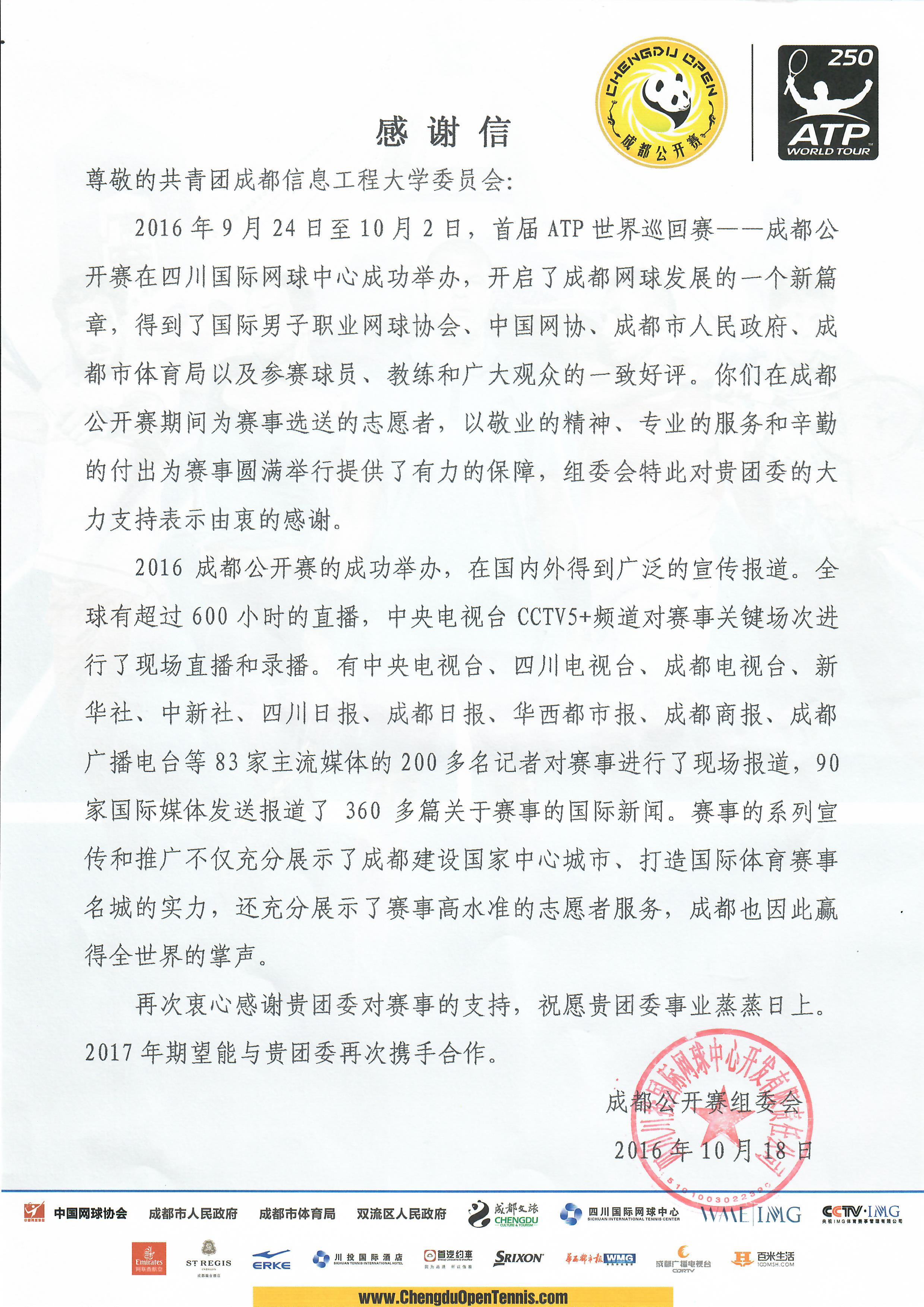 【本网讯】日前,首届ATP 世界巡回赛——成都公开赛组委会给乐动发来感谢信,感谢乐动为本届赛事的成功举办所提供的巨大帮助和支持,向乐动参与赛事服务的志愿者们表达崇高的敬意和由衷的感谢,并对乐动高效、规范、专业的志愿服务组织工作以及志愿者们的突出表现给予了高度评价。