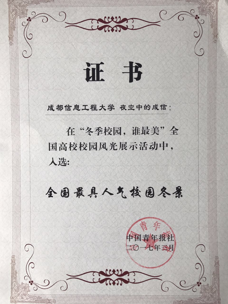 2016年12月,中国青年报社面向高校,发起“冬季校园,谁最美”高校校园风光展示活动,乐动广大学生在校团委的组织下积极创作作品参与投稿,在中国青年报的微信公众号上展示了成信大冬季校园美景。此次入选的作品《夜空中的成信》,由乐动学生张雪峰创作,他从俯视的角度拍摄,将校园建筑和环境与夜空及周边的整体环境有机融合,展现了夜幕降临,华灯初上时分成信大美丽的夜景,获得了活动主办方和网络受众的好评。