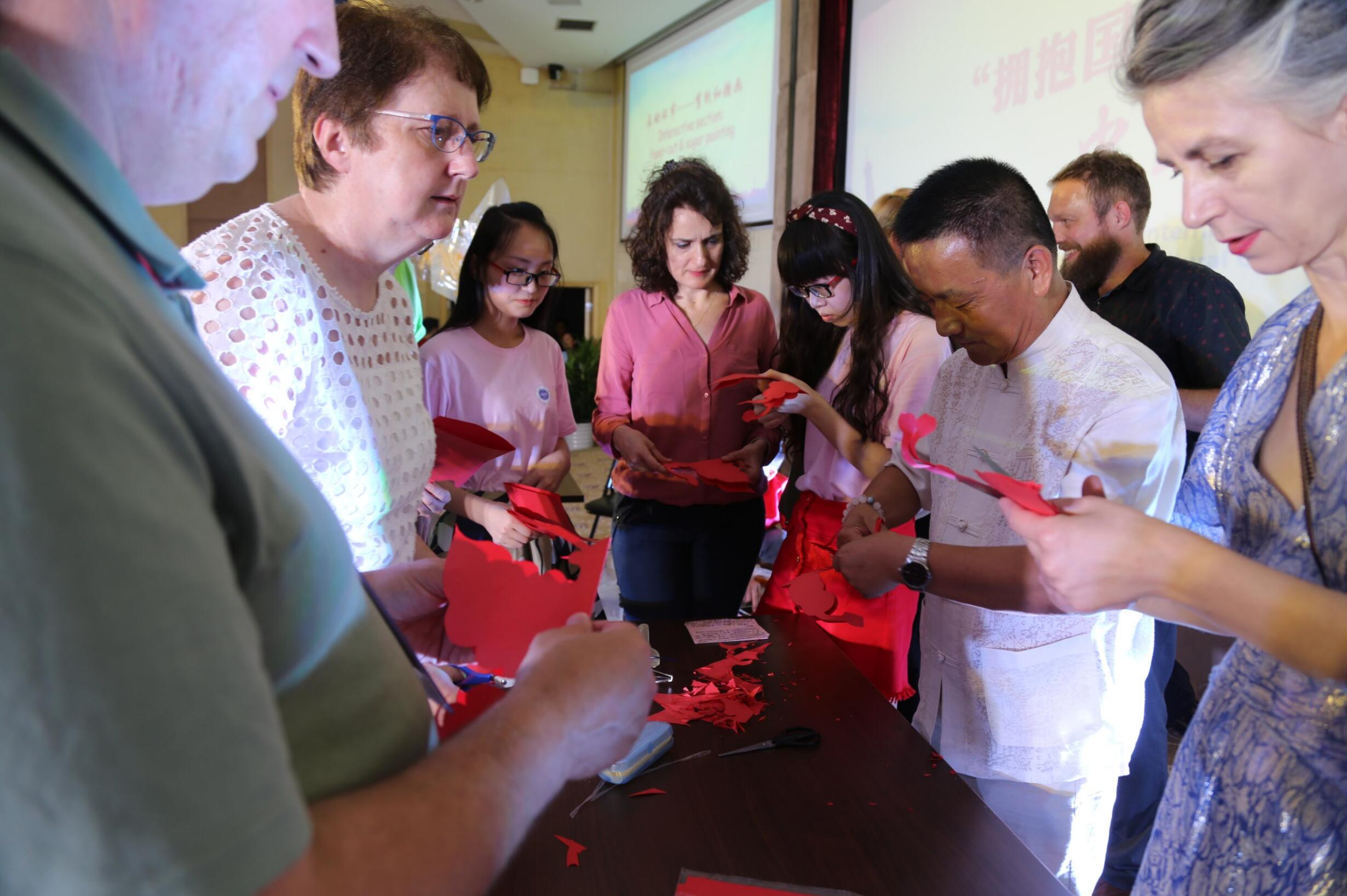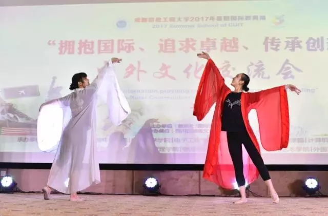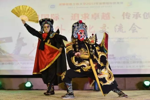 学校大学生艺术团A MUSE组合用充满青春和活力的流行舞《playing with fire》开场。《美猴王》的演绎,让美猴王的形象呼之欲出。由国家级非物质文化遗产川剧代表性传承人肖德美的弟子白爱伦带来的戏曲身段表演,让观众们感受到了中华传统文化的吸引力和川剧的独特魅力。互动环节上,两位中国非物质文化遗产——剪纸、糖画传承人为外宾送上精美的剪纸作品以及形状各异的糖画作品,他们不仅现场演示制作过程,还教授现场观众剪纸技艺,让全场师生对中国传统技艺有了更直观的了解,也让外籍专家感受到了中国传统文化的魅力。由艺术家们及大学生艺术团带来的二胡独奏《战马奔腾》、流行歌曲演唱《All about that bass》、双人舞《大鱼》、民歌独唱《在那东山顶上》、魔术表演、川剧变脸等精彩节目轮番登场,赢得了现场观众的阵阵掌声。