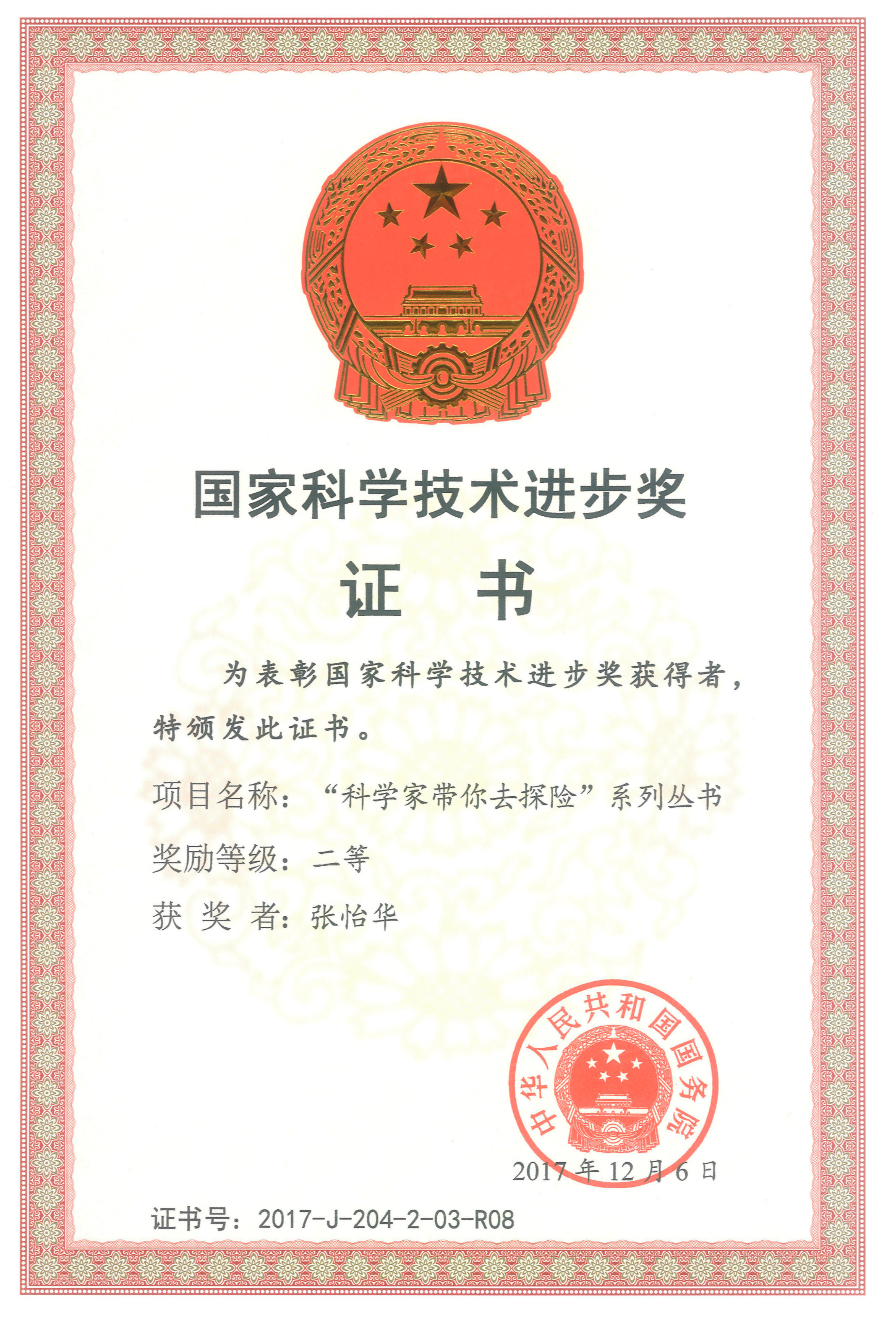 【本网讯】2017年度国家科学技术奖励大会近日在北京举行。由成都山地所张文敬研究员担任第一完成人、乐动图书馆教师张怡华参与完成的科普著作“科学家带你去探险”系列丛书荣获2017年度国家科技进步二等奖。张文敬参加颁奖大会并得到习近平、李克强等党和国家领导人的亲切接见,张怡华参加了国家科技进步奖颁奖大会。