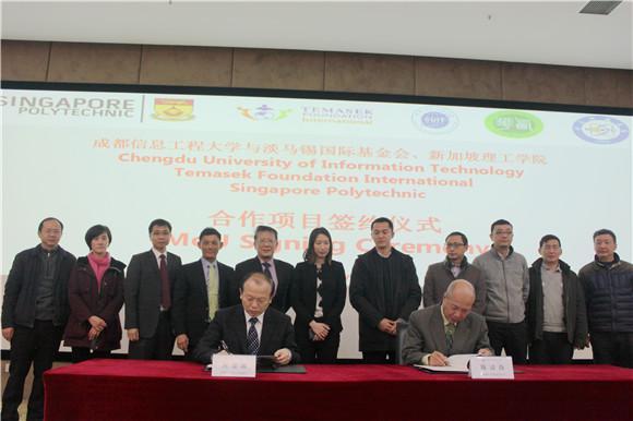 【本网讯】1月17日上午,学校与新加坡理工学院CDIO教师培训项目签约仪式在航空港校区国际会议厅举行。新加坡理工学院董事会副主席Johnny Tan Cheng Hye、淡马锡国际基金会执行总裁Benedict Cheong、新加坡驻成都总领事馆政务领事Melissa Tan、省教育厅国际交流服务中心副主任王拉沙、学校副校长何建新等参加签约仪式。签约仪式由学校国际交流与合作处副处长刘伟主持。