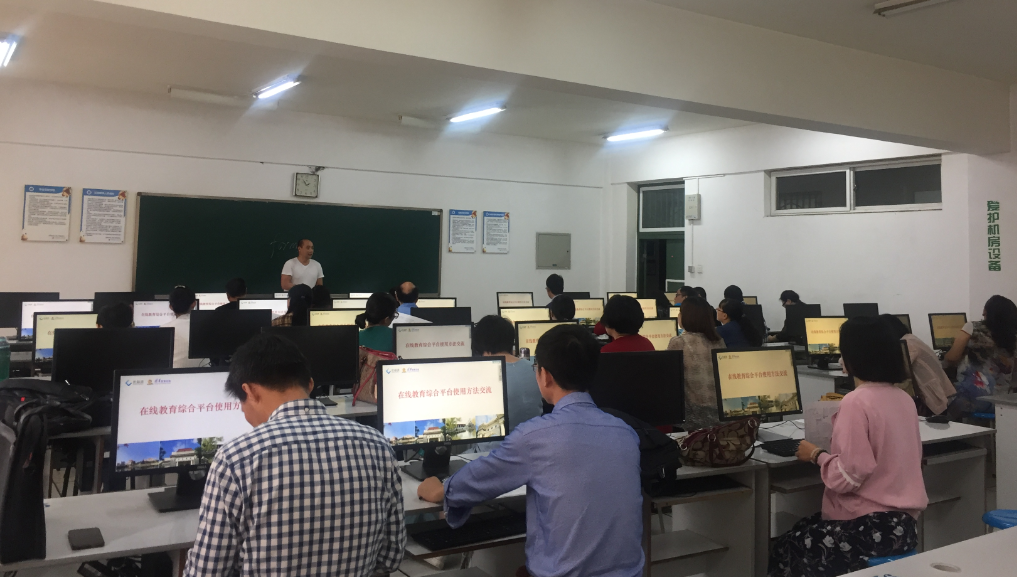 在线教育综合平台第一期现场集中培训于9月18日和19日分别在龙泉校区和航空港校区的5206和5207机房进行,来自全校各个单位的120余位教师参加了此次培训。本次培训由优慕课在线教育科技(北京)有限责任公司(原清华大学教育技术研究所)孙思唯老师主讲,采取面授与上机操作相结合的方式进行。孙思唯分别对新版在线教育综合平台的界面布局、课程管理、课程建设和学生学习统计分析等模块进行了介绍,对教师如何利用在线教育平台设置教学进度、发布课程通知、布置作业、在线测试、答疑讨论、上传教学课件等功能进行了详细讲解和演示。