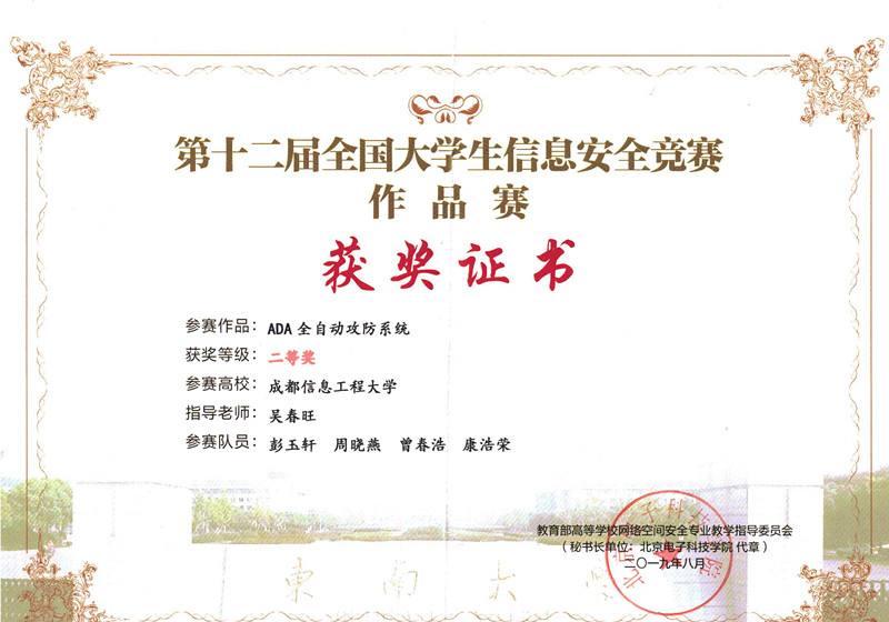 【本网讯】8月3日,第十二届全国大学生信息安全竞赛作品赛决赛在东南大学落下帷幕。本次全国大学生信息安全竞赛由教育部高等学校网络空间安全专业教学指导委员会和中国互联网发展基金会共同主办。乐动网络空间安全学院的彭玉轩、康浩荣、曾春浩、周晓燕四名同学共同完成的作品《ADA全自动攻防系统》以优异的成绩入围决赛,以总排名第50获得全国二等奖,实现了乐动参加全国大学生信息安全竞赛作品赛获奖零的突破。