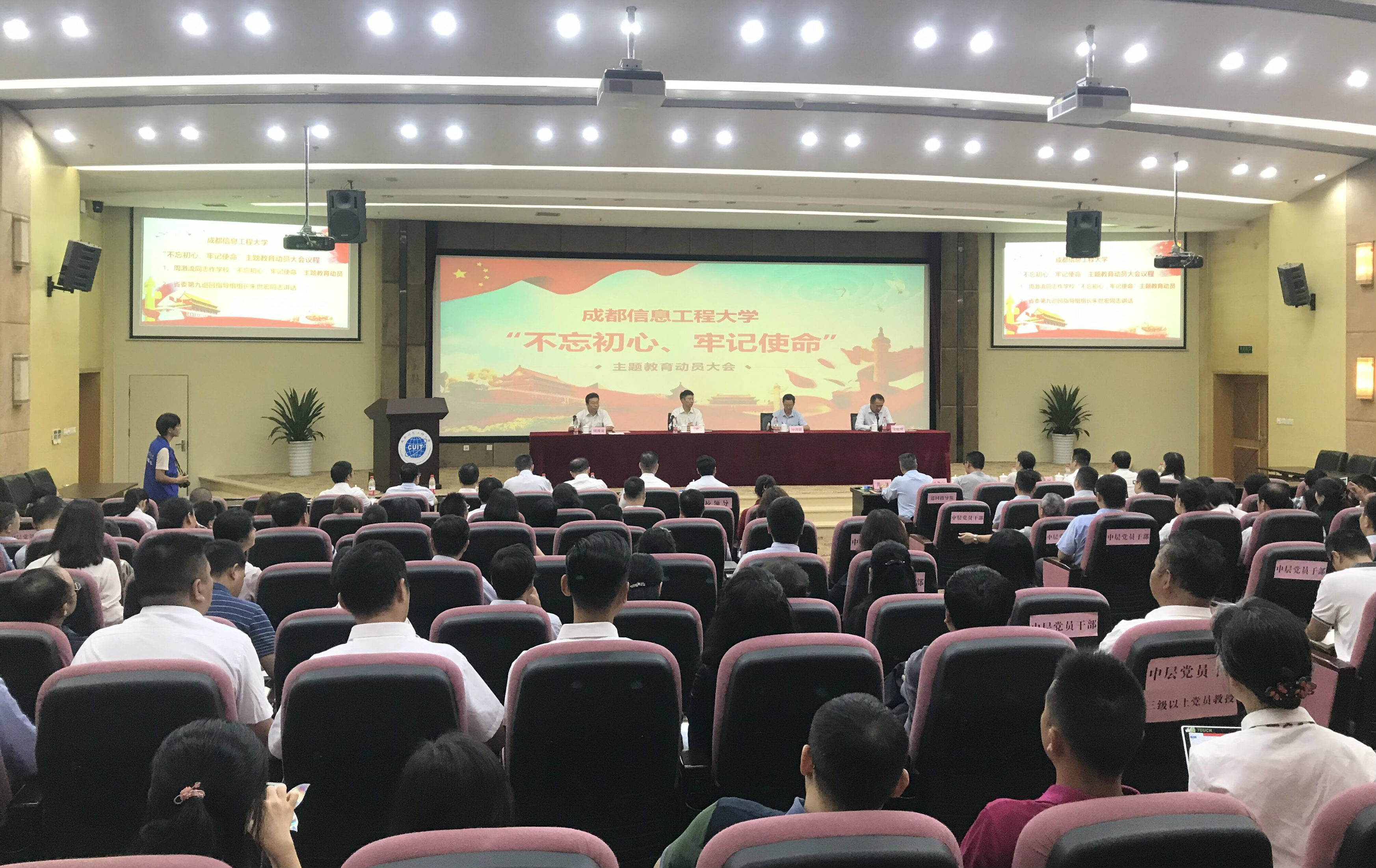 【本网讯】9月12日下午,学校“不忘初心、牢记使命”主题教育动员大会在航空港校区国际会议厅召开。省委第九巡回指导组全体成员,学校全体校领导,全体中层党员干部,三级以上党员教授,教代会主要负责人,省市党代表、人大代表、政协委员,民主党派(统战团体)主要负责人,科级党员干部代表,学生党员代表等参加了会议。省委第九巡回指导组组长朱世宏出席会议并讲话。学校党委书记周激流作“不忘初心、牢记使命”主题教育动员。学校校长余敏明主持会议。
