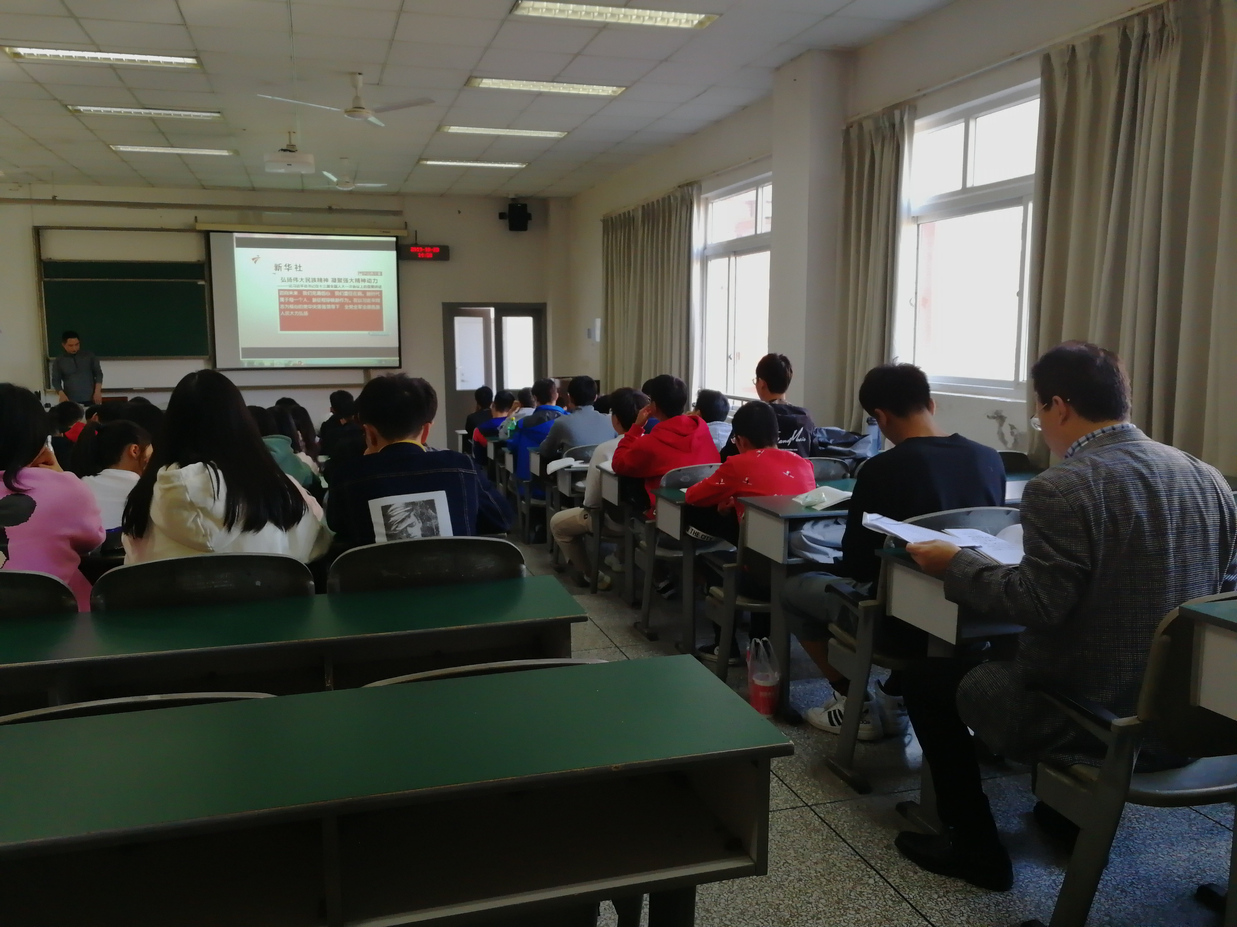 课堂上,冯巨帆老师授课的内容是中国精神,郑薇老师授课的内容是坚定理想信念。周激流与同学们一道全神贯注地聆听了两位老师的授课内容,认真做好授课笔记,对教师的教学水平、教学方法、教学效果,以及学生对思政课的学习状态、学习习惯、学习效果有了更全面的了解和掌握。