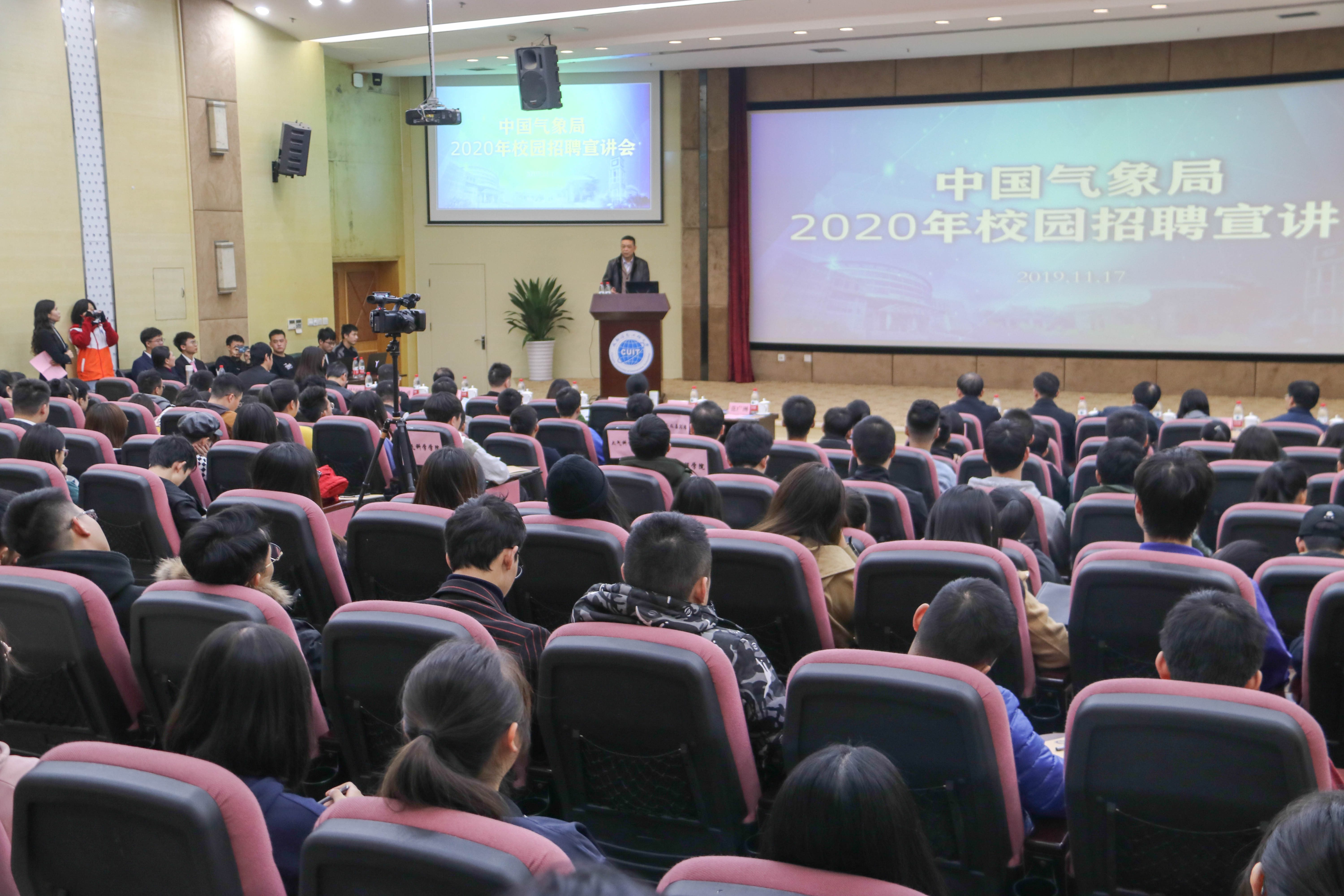 【本网讯】11月17日,学校在国际会议厅举办中国气象局2020年校园招聘宣讲会。本次宣讲会邀请了中国气象局原副局长许小峰、中国气象局人事司副巡视员张连强、中国气象局人事司综合处处长董章杭、中国气象局人才交流中心副处长蔡金玲、中国气象局人才交流中心招聘服务队成员乐青莅临现场。会议由大气科学学院党委书记张小红主持。学校副校长范广洲,党政办公室、科技处、研究生处、招生就业处、教务处等职能部门负责人,大气科学学院、资源环境学院和电子工程学院的全体院领导以及相关专业的应届毕业生和低年级学生等参加了宣讲会。