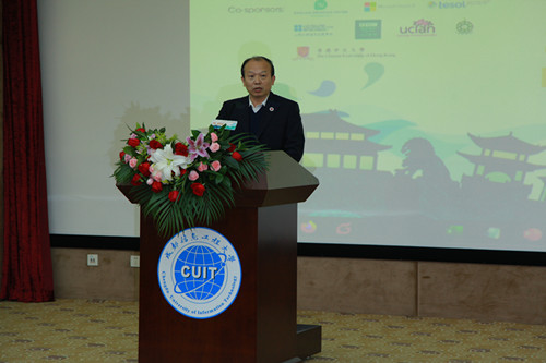 何建新在开幕式致辞中代表学校欢迎参加“21世纪·可口可乐杯”全国大学生英语演讲比赛川渝地区决赛的选手们来到成信大,感谢大赛组委会对学校的信任,并谈到,这项赛事对培养和提高中国青少年学生的国际交流能力有着重要作用。