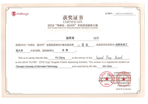 【本网讯】12月13日,2019“外研社·国才杯”全国英语演讲大赛总决赛于北京外研社国际会议中心落幕。乐动外国语学院176班的蒲思菁同学经过网络赛场初赛、复赛、决赛层层选拔,以网络赛场特等奖的优异成绩晋级全国总决赛,与来自全国31个省、市、自治区、澳门特别行政区选手及在华留学生组成的182名选手展开激烈角逐,并最终获得全国决赛二等奖。这是迄今为止乐动学子在该项赛事中取得的最好成绩。外国语学院吴倩老师同时荣获2019“外研社·国才杯”全国英语演讲大赛全国决赛指导二等奖。
