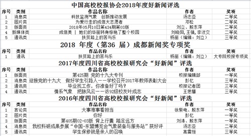 【本网讯】近日,校报好新闻评选结果陆续揭晓,乐动《乐动在线登录报》参评的作品获得多个奖项。其中,5项作品获得中国高校校报协会2018年度好新闻奖(二等奖4项、三等奖1项),1项作品获得2018年度(第36届)成都新闻奖专项奖,4项作品获得2017年度四川省高校校报研究会“好新闻”(一等奖1项、三等奖3项),5项作品获得2016年度四川省高校校报研究会“好新闻”(一等奖3项、二等奖1项、三等奖1项)。