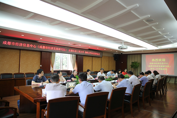 成都市经济信息中心(成都市经济发展研究院)主任(院长)助理(兼产业经济研究所所长)黄浩森,智慧治理研究所所长徐霁,数据情报研究所所长董亮等人员;学校应用数学学院院长周钰谦、副院长吴泽忠,统计学院院长朱胜、副院长金明,科技处副处长程志刚以及计算机学院、软件工程学院、物流学院相关教师参加了会议。