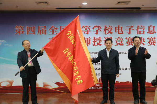 受中国电子学会和竞赛组委会委托,该项赛事2021年将由乐动承办。颁奖仪式上,乐动何建新副校长从齐鲁工业大学(山东省科学院)副校(院)长曹茂永手中接过赛事会旗,象征着2021年第五届全国高等学校电子信息类专业青年教师授课竞赛正式花落乐动。
