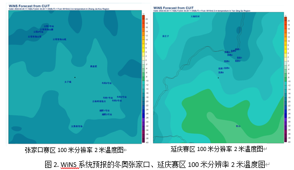 冬奥会期间,乐动在线登录保障团队分成三个小组轮流保障张家口、延庆、京津冀三个赛区预报产品的实时传输,为张家口、延庆两个赛区提供风、温度、降水、能见度、湿度等水平分辨率100米的预报产品,为京津冀赛区提供水平分辨率500米的预报产品。其中,对张家口赛区、延庆赛区风、温度的预报效果在冬奥会举行期间表现突出。如下,图1为WiNS系统冬奥张家口、延庆赛区风场图,图2为WiNS系统冬奥张家口、延庆赛区100米分辨率2米温度图。