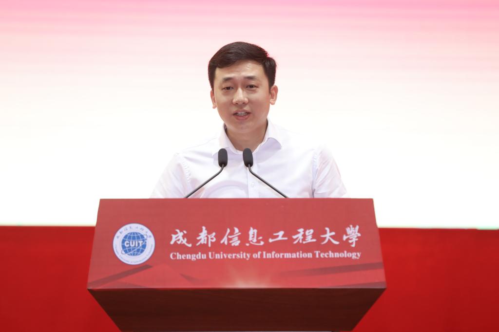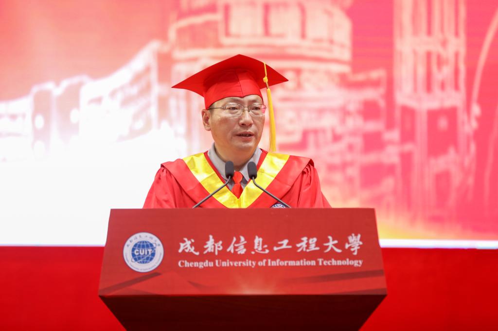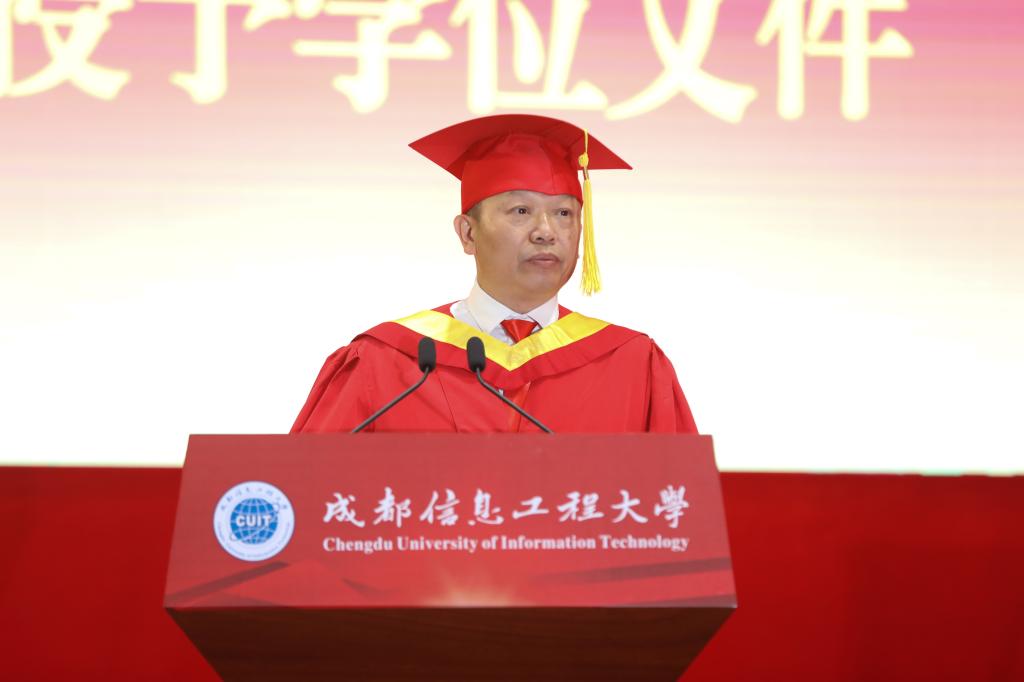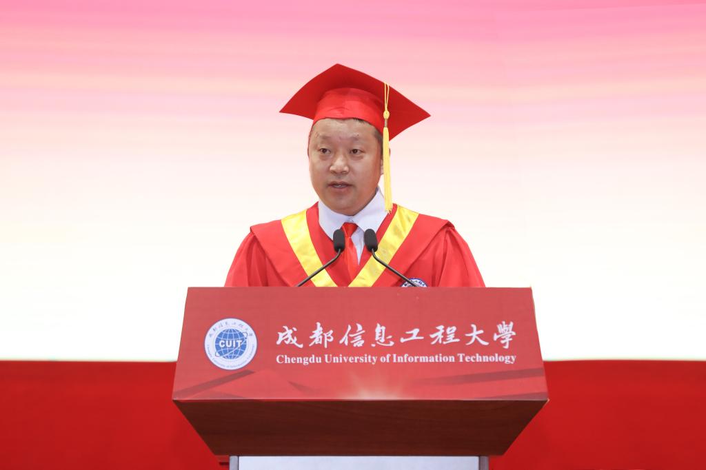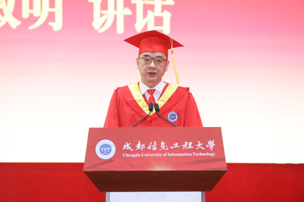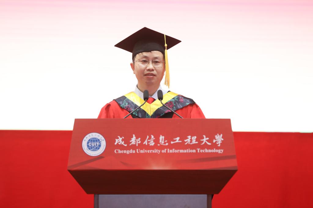 四川省学术和技术带头人后备人选、四川省电子信息与兵器类专业教学指导委员会委员、四川科技青年联合会副秘书长、成都新材料学会副会长、学校光电工程学院院长杨定宇教授作为教师代表发言。他代表学校全体导师向本届毕业生同学们顺利毕业表示祝贺,带领大家回顾了四年来不平凡的经历和历史,并希望毕业生们要胸怀“国之大者”,戒骄戒躁、脚踏实地,扎根基层、扎根人民,找准定位;要常怀感恩之心,感念国家的培养、父母的养育、老师的教诲、朋友的帮助、时代的赋予,多一点感激和付出,将爱永远传递;要永葆平常心态,保持一颗淡定从容的心,铭记“舍”与“得”的辩证关系,勇敢前行。