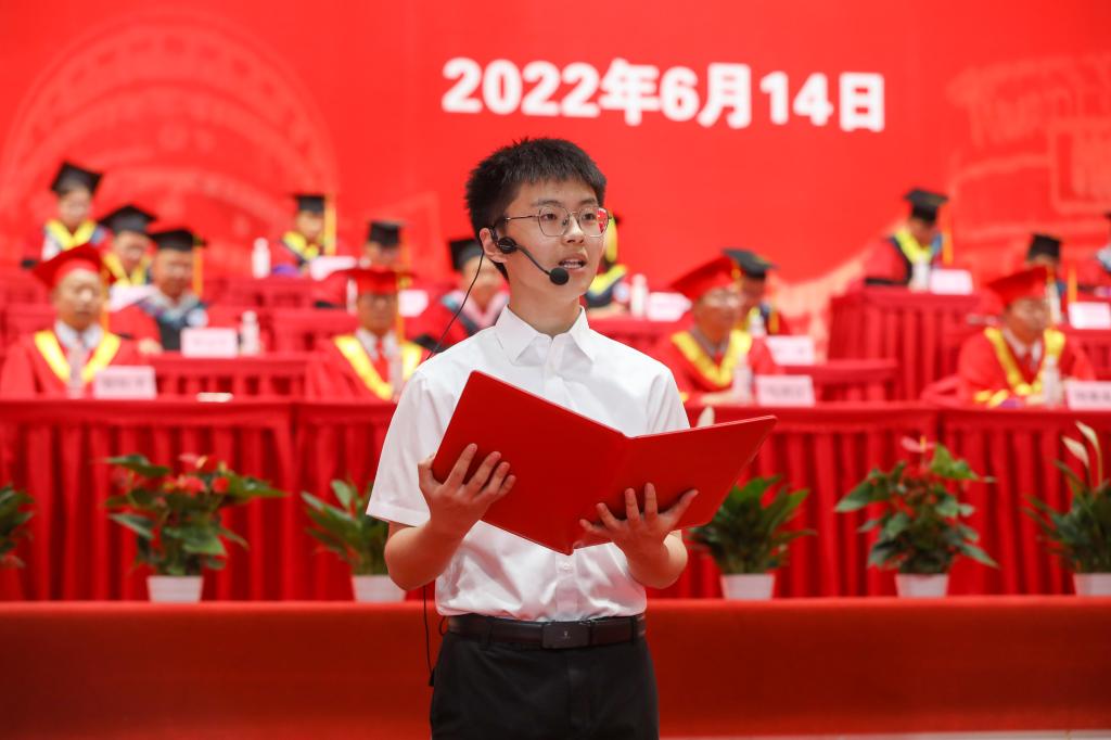 2022届毕业生代表、青春榜样“十佳青年学生”称号获得者、物流学院研究生李玉玺和2020级在校生代表、电子工程学院宋琦文同学诵读了自己创作的《花开时节、一路芬芳》,回忆了在成信校园的美好时光、深厚的同窗情和师生情,表达了对毕业生的真切祝福、对母校的眷恋以及成信学子奔赴祖国各地以真才实学服务人民,用创新创造贡献国家的豪情壮志。