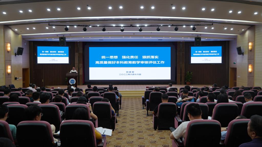 何建新作了题为《统一思想、强化责任、狠抓落实,高质量做好本科教育教学审核评估工作》的报告。围绕评估的必要性与意义、评估背景、评估工作的新变化、新要求以及评估指标体系与流程等内容,详细介绍了乐动自评自建总体进度、前期工作推进情况等内容,并对下阶段评建重点工作进行了梳理和安排布置。他要求各责任单位要严格对标对表,按时完成各项自评建设任务,确保各项评建工作有序有效落实。