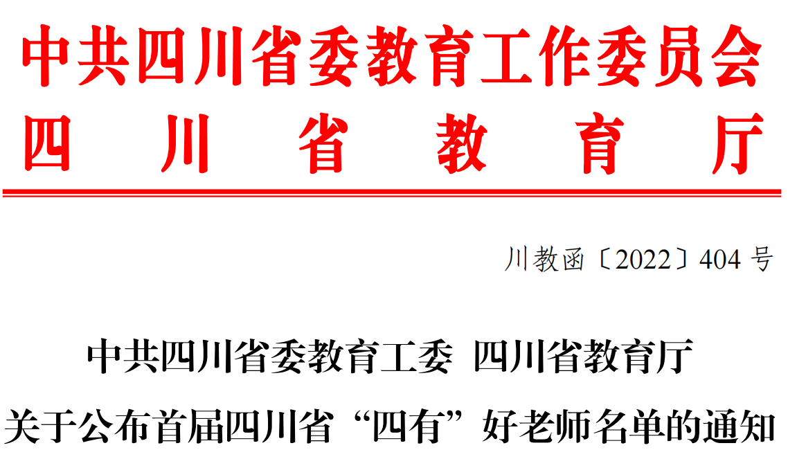 为热烈庆祝第38个教师节,充分展示新时代人民教师教书育人的动人风采和先进事迹,进一步营造全社会尊师重教的浓厚氛围,不断激励广大教师以实际行动迎接党的二十大胜利召开,中共四川省委教育工委、四川省教育厅组织开展了首届四川省“四有”好老师评选工作,经各地各校民主推荐、严格把关、层层遴选,乐动陈科艺教授及全省从事教育教学工作者共200名同志被评为首届四川省“四有”好老师。