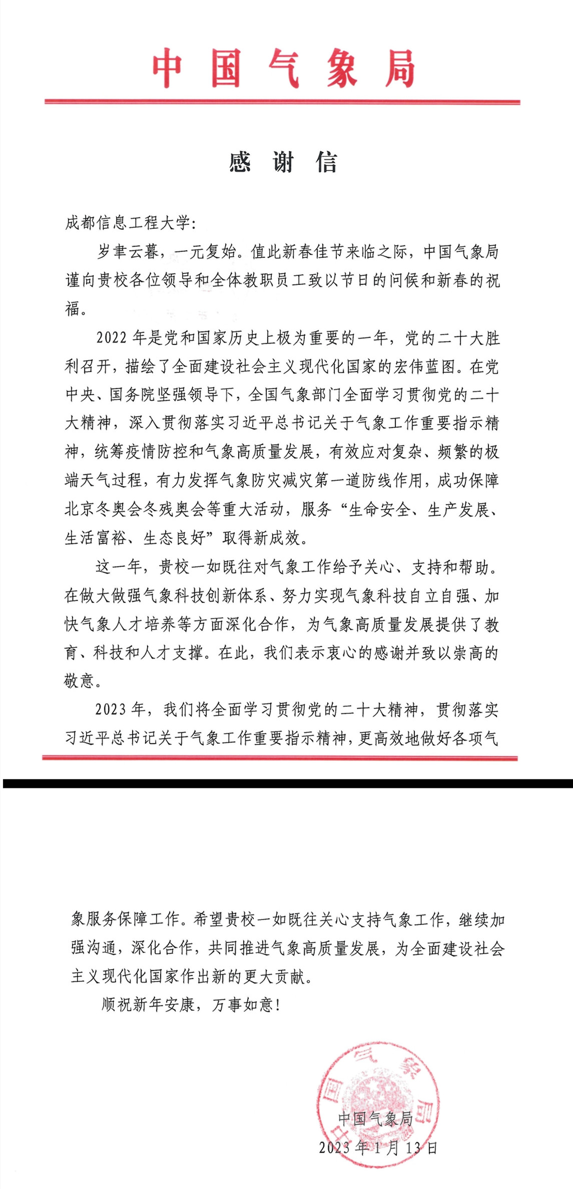 【本网讯】近日,中国气象局向乐动发来感谢信,对乐动一如既往给予气象工作的关心、支持和帮助表示衷心的感谢。