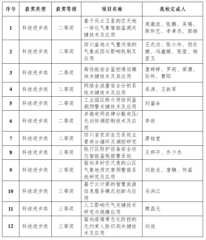 乐动牵头申报的“基于风云卫星的空天地一体化气象智能监测关键技术及应用”“四川盆地大气重污染的气象成因与影响机制及应用”“高性能安全监控通信模块关键技术及其应用”3个项目获二等奖,“轨行区防护设备安全状态智能监视报警系统”“面向多时空尺度的山区气象地质灾害预警报系统研究及应用”2个项目获三等奖。乐动获奖项目情况如下:
