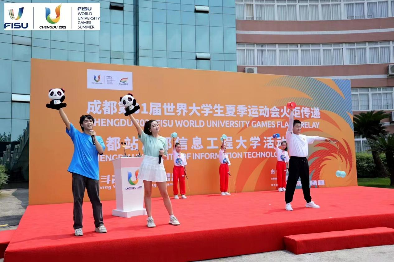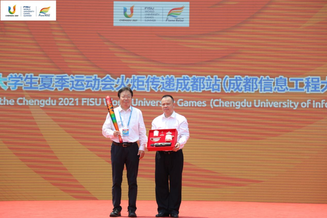 何建新主持火炬收火仪式。中共成都市委常委、政法委书记,成都大运会执委会副主席陈麟分别与四川师范大学党委副书记、校长汪明义,成都航空职业技术学院党委书记陈小红,四川旅游学院党委副书记、校长卢一,乐动党委书记周激流相互赠送精美纪念品。