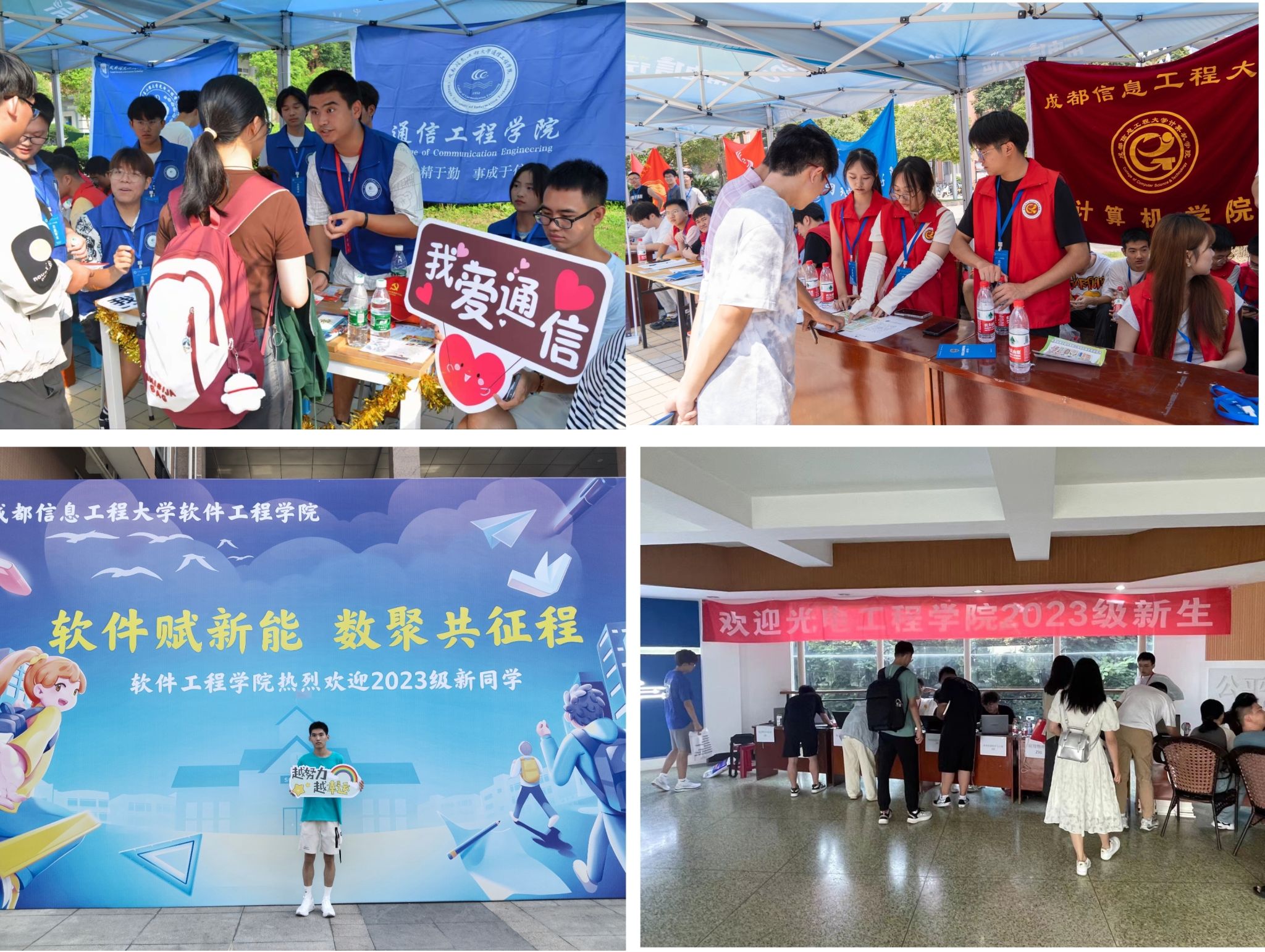 各学院为了迎接新成员用心安排布置了喜庆精美的合影墙、党员志愿服务、实验室作品展示、欢迎标语、吉祥物、签名板等学科特色鲜明、文化韵味十足的“见面礼”,让2023级同学的新起点、新面貌被共同见证和温馨定格。