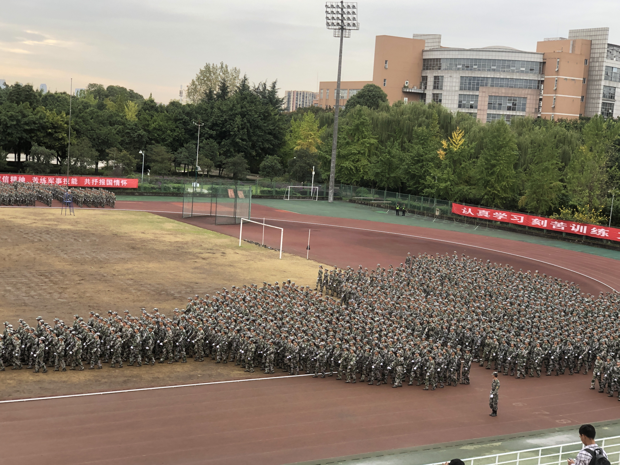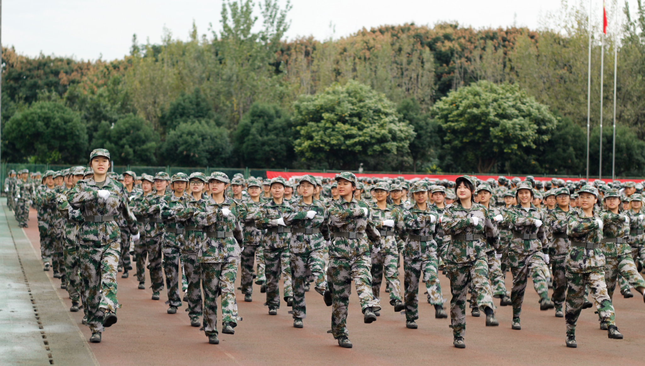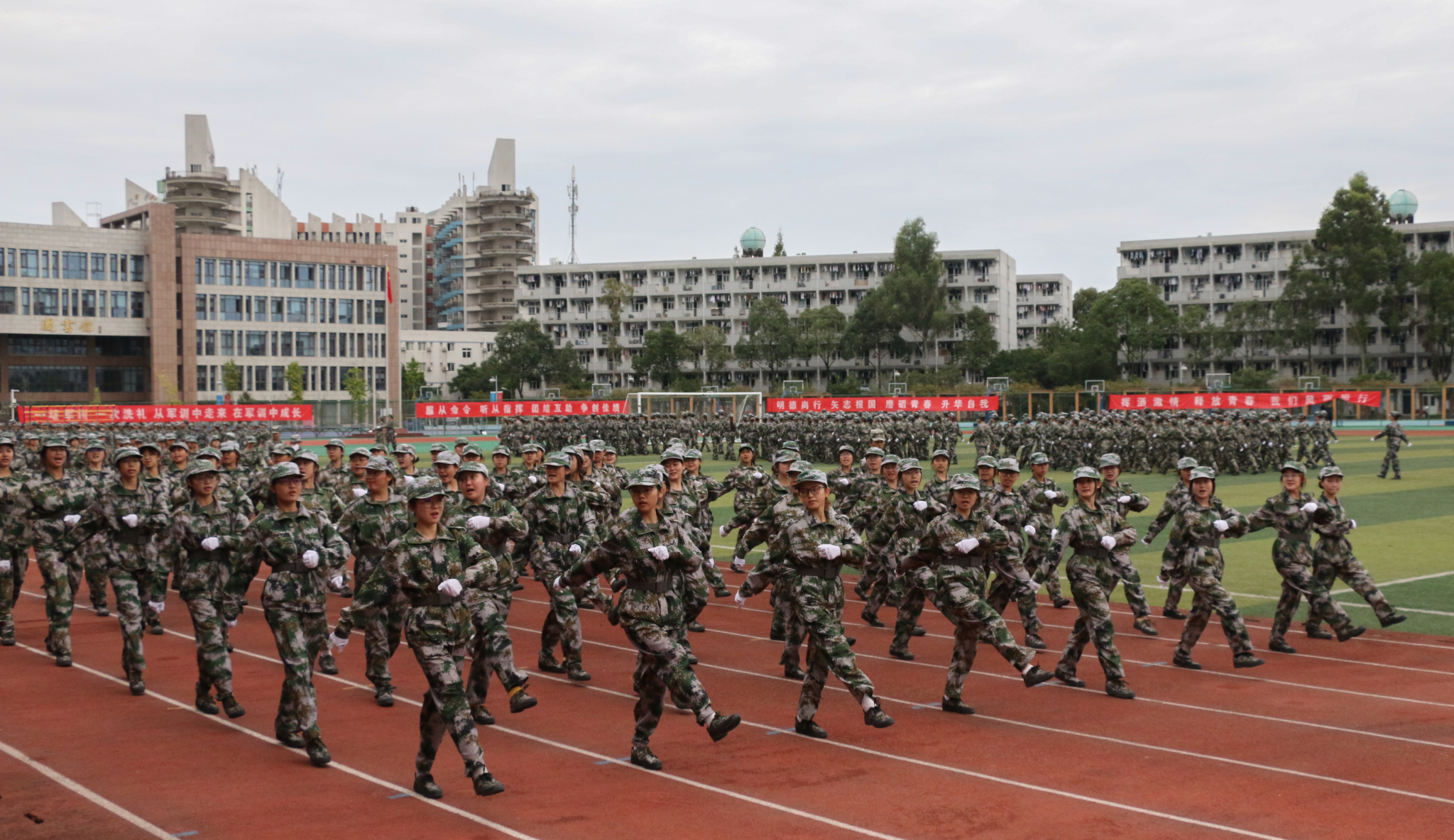 汇报表演伴随着《分列式进行曲》洪亮高亢的曲调拉开帷幕。各个参训的学生军训方阵统一身着迷彩服,他们迈着坚定整齐的步伐、喊着嘹亮的口号、斗志昂扬地走过主席台接受检阅。