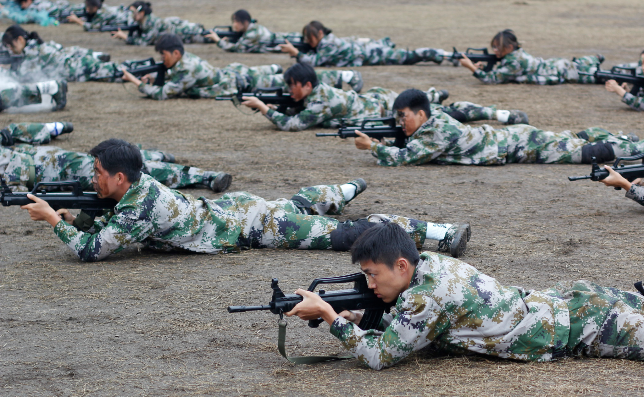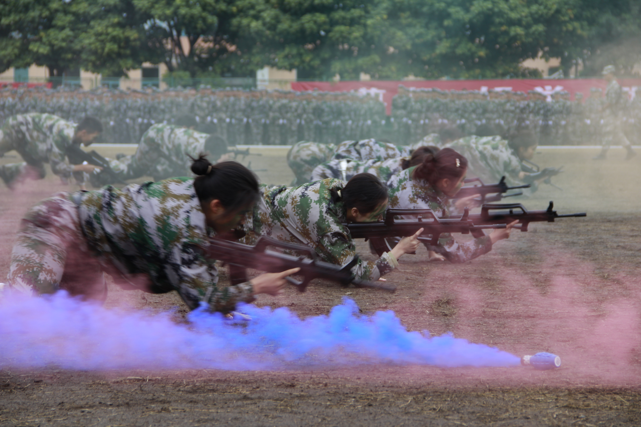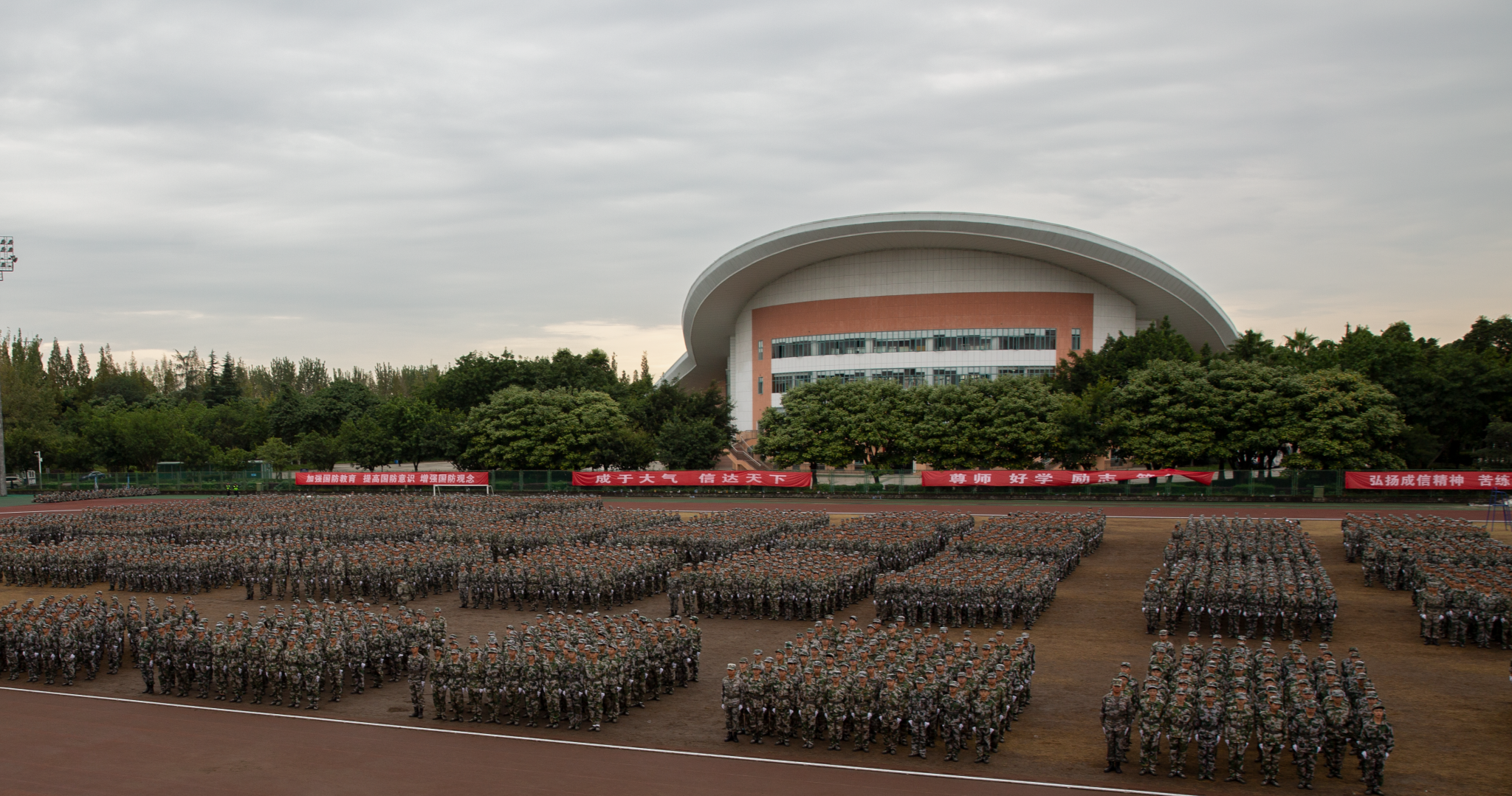 汇报表演伴随着《分列式进行曲》洪亮高亢的曲调拉开帷幕。各个参训的学生军训方阵统一身着迷彩服,他们迈着坚定整齐的步伐、喊着嘹亮的口号、斗志昂扬地走过主席台接受检阅。