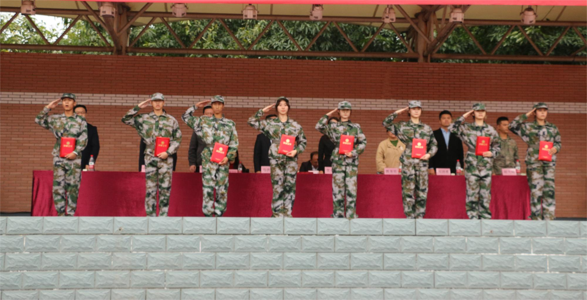 汇报会现场举行了升国旗仪式,在雄壮激昂的国歌声中,全体参会人员起立,2023级参训学生身姿挺拔立正,向冉冉升起的国旗行注目礼。