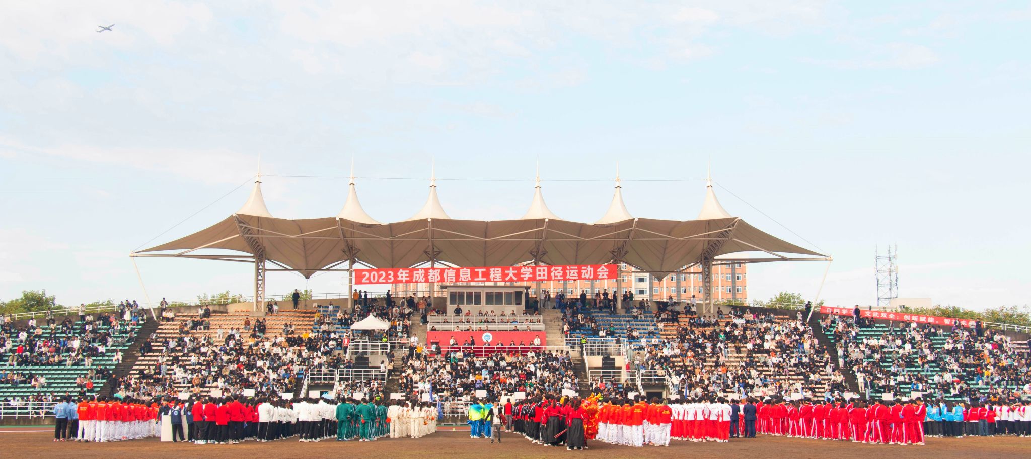 运动员代表入场仪式在慷慨激昂的进行曲中拉开序幕,20余个来自各学院的运动员和教职工代表队,英姿勃发、整齐划一地步入运动场,呈现出特色鲜明、生动活泼的花式队形,充分彰显了成信人自信自强、拼搏奋进的昂扬精神风貌。在现场观众的欢呼喝彩声中,由体育部、校团委和来自各学院的同学们带来了精彩的开幕式表演,伴随着热情洋溢的歌曲,苍劲有力的中国风街舞节目《龙拳》、活力四射的团体操《青春飞扬》和神采飞扬的舞龙舞狮等体育艺术表演项目,为现场观众带来一场视觉盛宴。