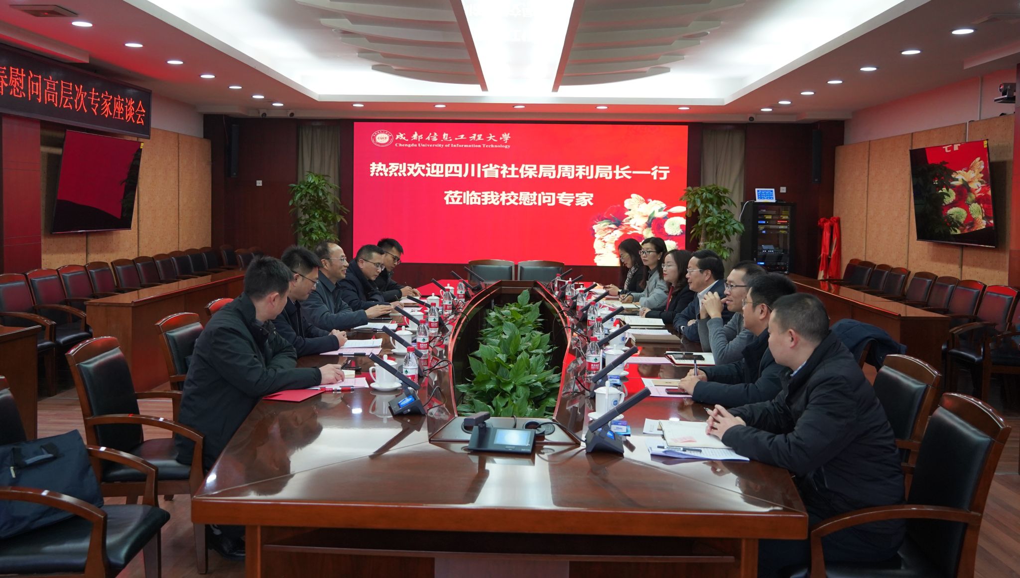 【本网讯】1月17日上午,四川省社会保险管理局局长周利代表四川省人力资源和社会保障厅,带队省社保局省本级社保二处处长雷斌、省专家服务中心副主任周巍等一行5人,走访慰问乐动专家代表、国家重要人才计划特聘教授、教育部新世纪优秀人才计划入选者、四川省有突出贡献的优秀专家、四川省三八红旗手,学校副校长罗小蓉教授。乐动党委书记沈火明,党委组织部、党委统战部部长熊建,党政办公室主任何晋,人事处处长杜国宏以及部门相关负责人参加了慰问座谈会。会议由杜国宏主持。