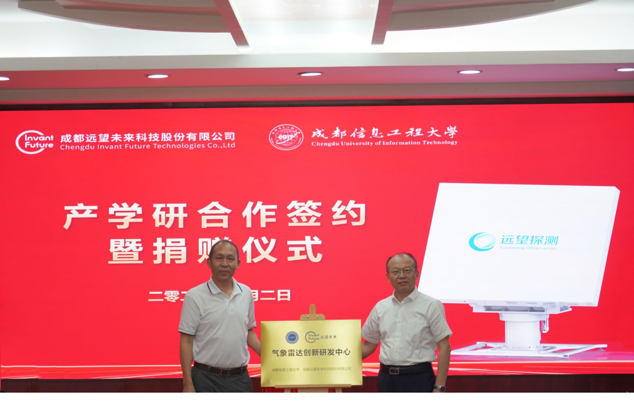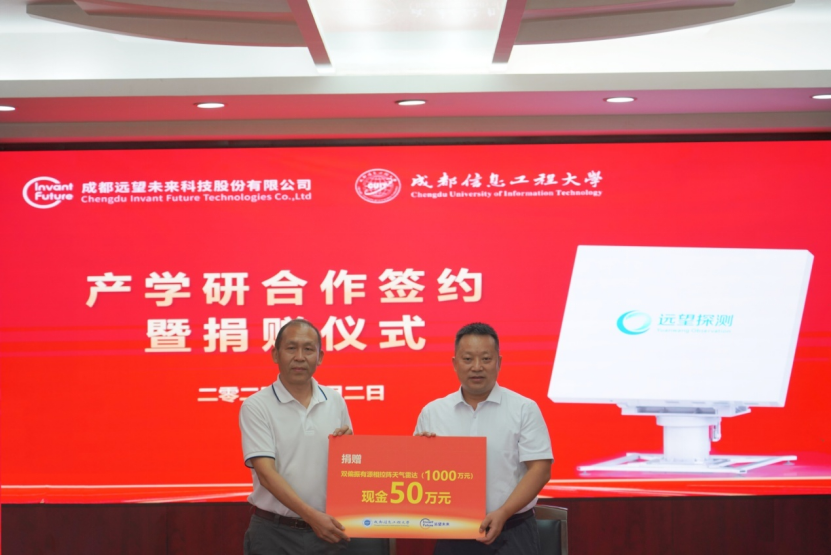 舒红平和邓思华代表双方共同签署产学研合作协议。成都远望未来科技股份有限公司为学校捐赠大功率高精度X波段双偏振有源相控阵天气雷达(1000万元)以及现金50万元。