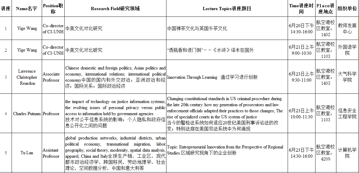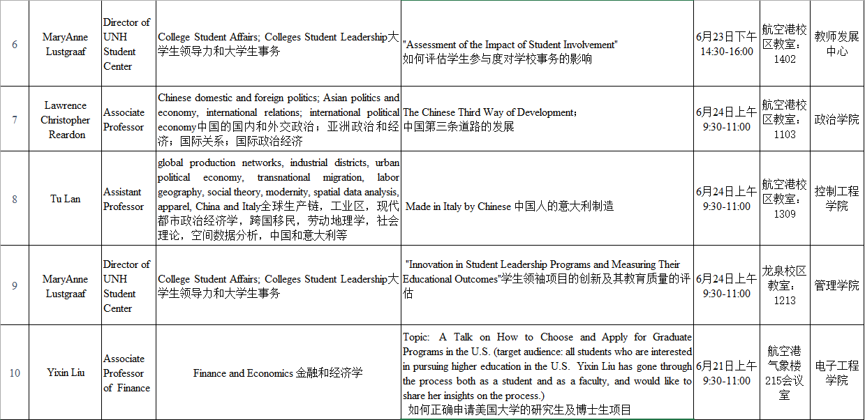 来自美国新罕布什尔大学的教授一行,将于6月20日至6月24日在乐动开展12场讲座,时间和地点安排如下:
