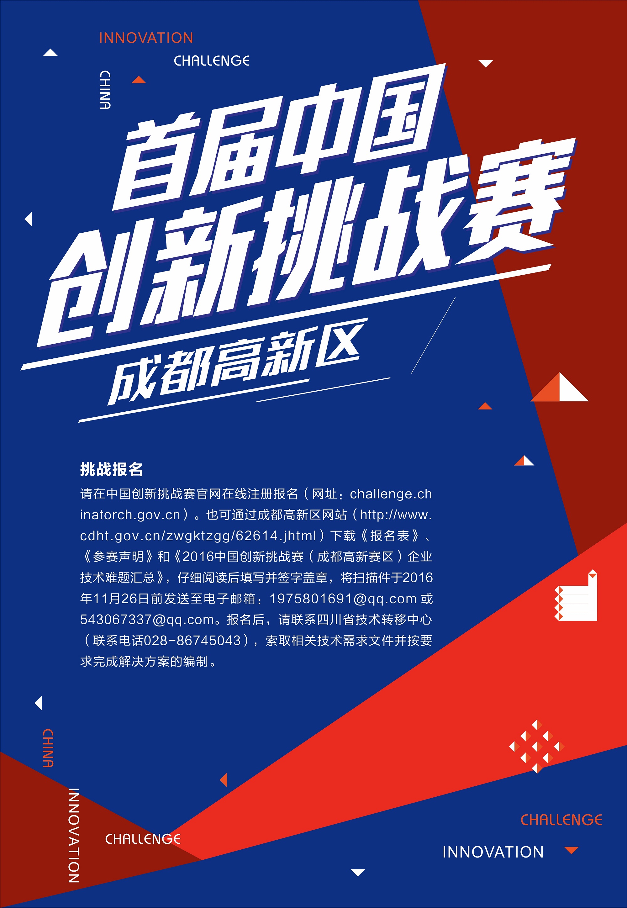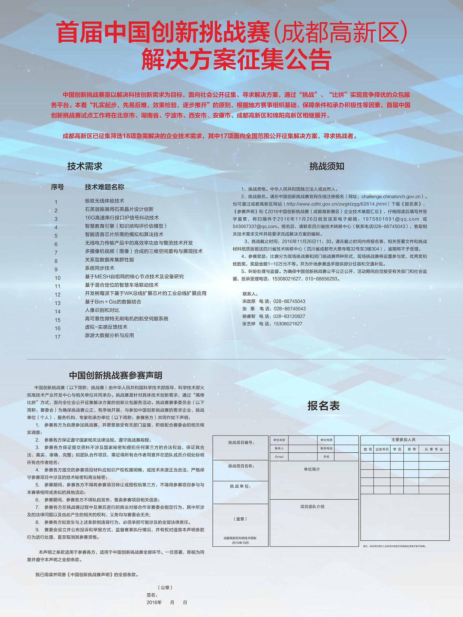 相关公告及资料下载链接:首届中国创新挑战赛(成都高新区)解决方案征集公告