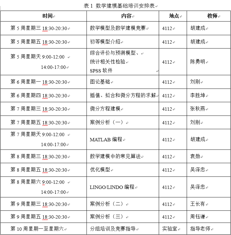 为了培养乐动学生的创新意识及运用数学方法和计算机技术解决实际问题的能力,应用数学学院2019年继续组织和指导大学生数学建模竞赛系列活动,竞赛主要包括:全国大学生数学建模竞赛选拔赛(即五一数学建模竞赛),2019年全国大学生数学建模竞赛,全国高校密码数学挑战赛等。应用数学学院数学建模指导组从第五周到第十周开始培训,分别从数学建模基础、数学建模算法、数学建模竞赛、数学建模案例分析到常用软件等方面进行培训,欢迎对数学建模及数学建模竞赛的同学积极报名参加培训,培训安排见表1。