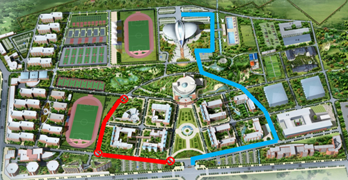 (二)校园车辆实行单循环通行,均从正大门进,西二门出,详见示意图“蓝色线”指示路线。