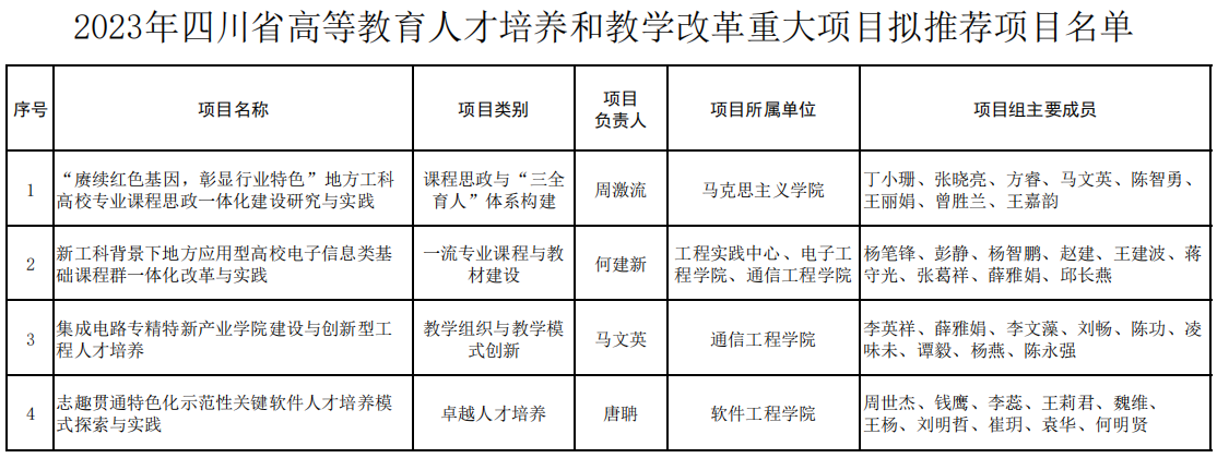 关于2023年四川省高等教育人才培养和教学改革重大项目拟推荐项目的公示