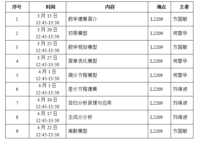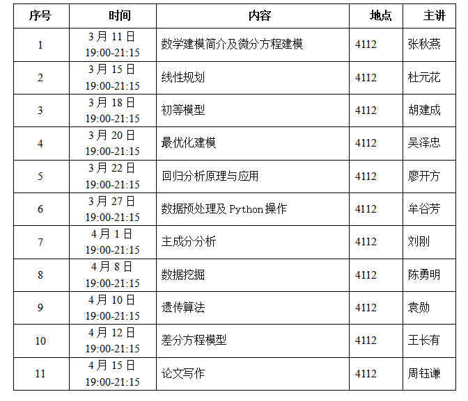 为了培养乐动学生的创新意识及运用数学方法和计算机技术解决实际问题的能力,应用数学学院2024年继续组织和指导大学生数学建模竞赛系列活动,竞赛主要包括:全国大学生数学建模竞赛选拔赛(即五一数学建模竞赛),2024年全国大学生数学建模竞赛,全国高校密码数学挑战赛等。应用数学学院数学建模指导组从第3周开始培训,分别从数学建模基础、数学建模算法、数学建模竞赛、数学建模案例分析到常用软件等方面进行培训,培训安排见表1(航空港)、表2(龙泉)。