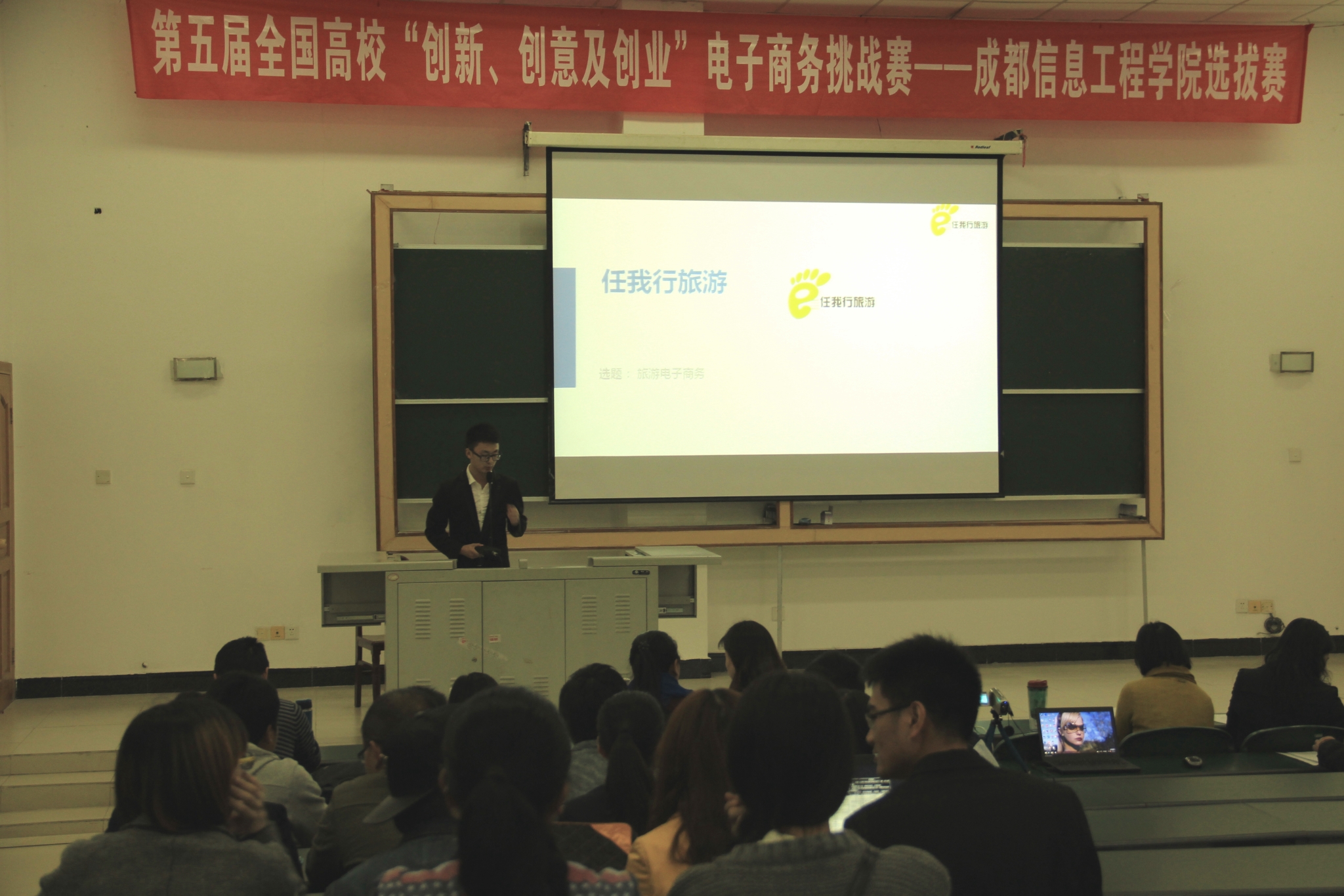 【本网讯】4月12日早9时,由我院物流学院和成都信息工程学院大学科技园(成都研究院)共同承办的第五届全国高校“创新、创意及创业”电子商务挑战赛——成都信息工程学院校级选拔赛在龙泉校区3101教室隆重举行。截止目前为止,我院共有50多支学生团队报名参加全国高校电子商务“三创赛”,是全省报名最多的一所学校。在校级选拔赛上,这些团队进行了精彩演讲和答辩,他们来自全校各个学科和专业,包括电子商务、物流管理、物流工程、市场营销、旅游管理、会计学、艺术设计、信息管理与信息系统、计算机应用、环境工程、自动化、软件工程、光电科学等专业的学生,首次实现跨校区融合参与的可喜局面。物流学院电子商务教研室全体老师亲临现场担任评委。