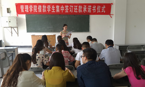 助学贷款是党中央、国务院加速人才培养,促进我国教育事业发展的重要举措。为确保助学贷款工作长期、持久、良性地发展下去,增强同学们诚信还款意识,管理学院开展了本次还款承诺书的签订仪式。仪式上,李筱雅老师详细介绍了生源地信用助学贷款的政策,强调了按时还款、诚信还贷的重要性;刘宇老师具体讲解了助学贷款还款的方式和途径;最后,组织毕业班助学贷款同学认真填写了《成都信息工程学院生源地信用助学贷款学生还款承诺书》,并郑重地签名。