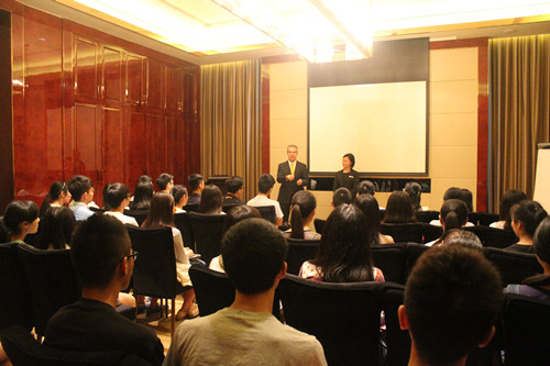 简短的欢迎仪式后,酒店总经理Clark围绕“奢华”介绍了丽思卡尔顿酒店的品牌文化。人力资源副总监Aries向同学们介绍了酒店从业人员所需的基本素质,和同学们分享了自己的酒店从业经历及一些体会。