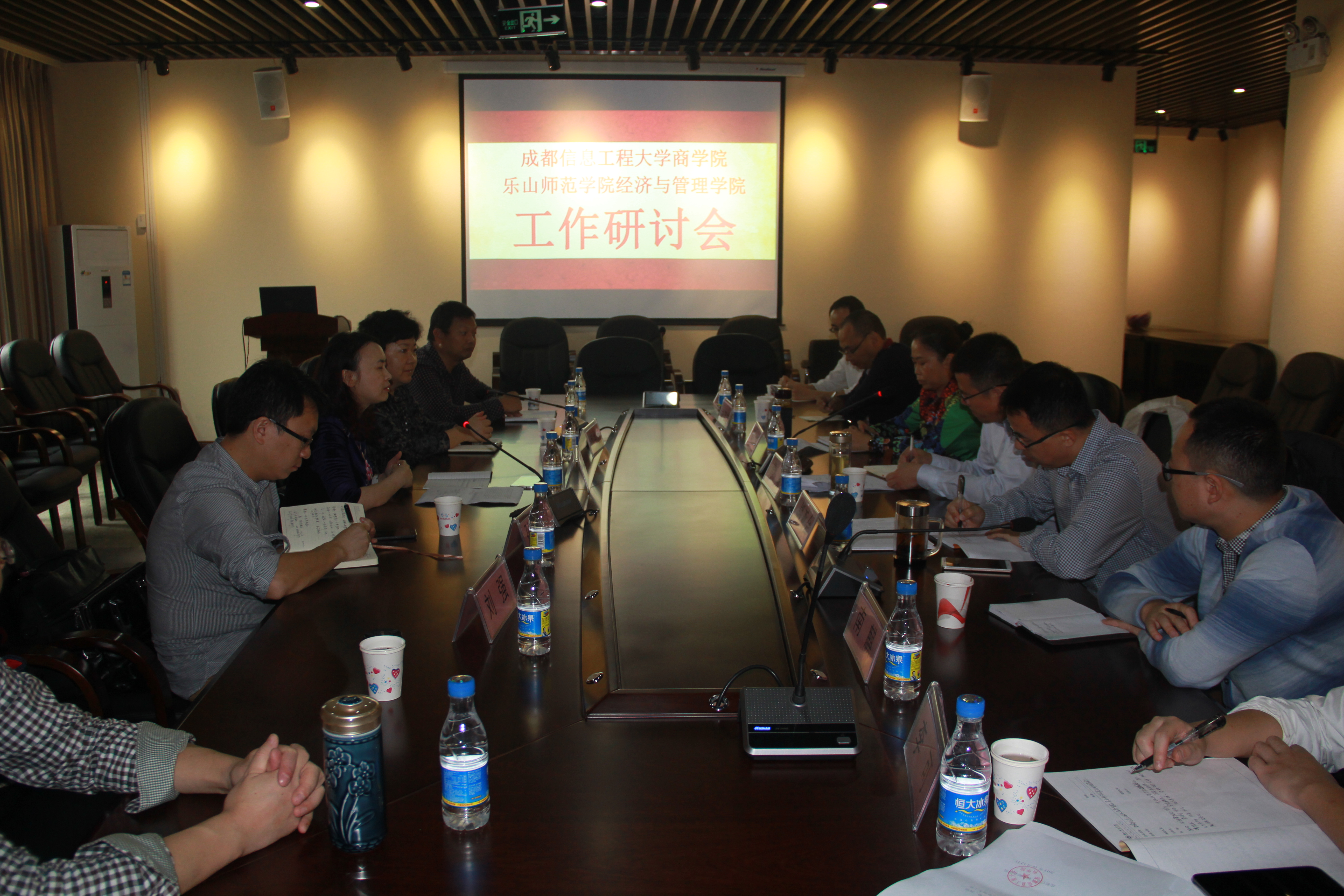 【本网讯】10月16日,商学院院长曹邦英率领部分骨干教师赴乐山师范学院经济与管理学院交流。乐山师范学院经济与管理学院院长龚晓、党总支书记邓健热情的接待了曹邦英一行。