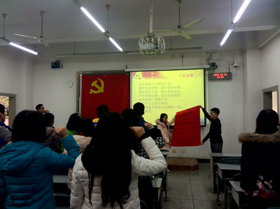 本次大会共5个环节,在李川徽同志的主持下,全体起立,奏唱国际歌。电子工程学院学生第二党支部书记陈敏老师对即将纳入的新党员寄予希望,对党员的思想言行提出要求并时刻要起着带头作用。谭博夫同学做转为中共正式党员的个人情况汇报,并由李川徽同志宣读支委会决议以及全体中共正式党员举手表决。叶聪颖等21名同志依次做转预备党员的个人思想汇报,并宣读支委会决议及举手表决。最后,在李川徽同志的带领下,进行预备党员宣誓。至此,大会结束。