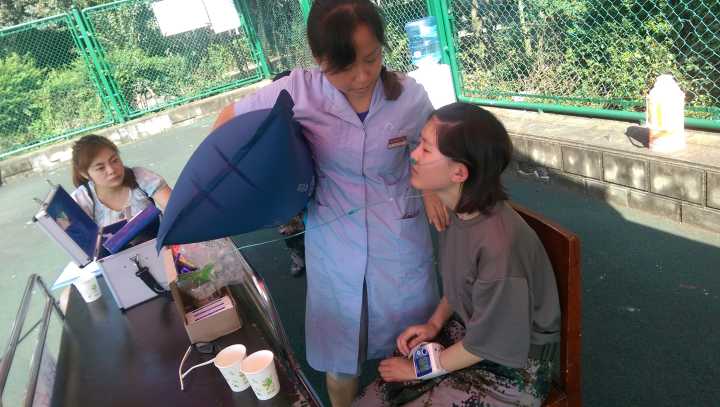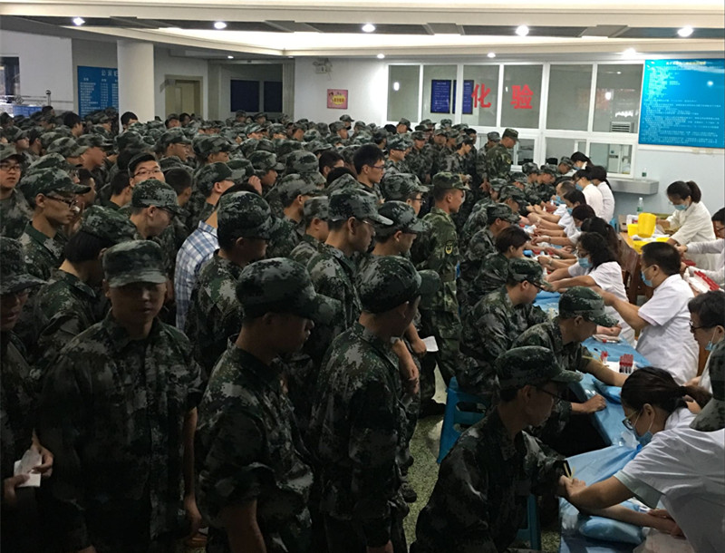9月13—14日为在军训期间抽血项目检查。两天之内完成4000余人的抽血体检工作,又逢两天下雨。为了不使同学们长时间淋在雨中,我们合理安置好同学,并安排医护人员在侯检场地巡视,及时疏导侯检人流,避免人多拥挤的紊乱现象,随时观测有无晕针或其它不适的学生,引导新生有序的完成整个抽血体检过程。同时,为使体检学生个人信息更加准确化,卫生中心医务人员走遍64个排,再次详细通知填写体检单详细内容,争取落实到每一个同学。