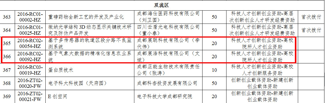 经过科技局的严格评审,成创空间在孵企业成都宸聪科技有限公司的项目《基于多传感器的轨道区段分路不良监测系统》和成都宸浩科技有限公司的《基于气象大数据的精准化信息农业系统》均成功获得2017年第一批科技人才创新创业资助(高校院所创新创业人才资助),每个资助项目金额高达20万元。