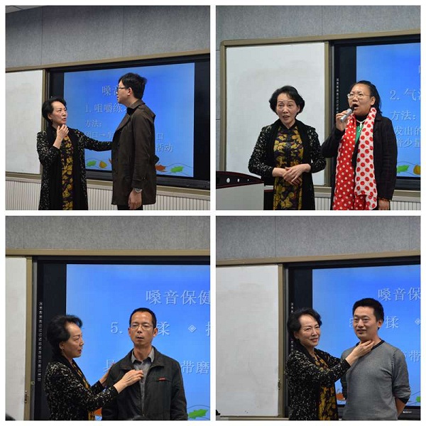 赵凤英作题为《科学发声与嗓音保健》的专题讲座。她强调声音对于教师职业的重要性,并简要介绍了一些常见的嗓音疾病及治疗方法,从嗓音保健的角度出发,通过示范、集体练习与个别诊断相结合的方式,帮助在场老师掌握科学发声要领、预防嗓音疾病。赵教授指导老师们进行了咀嚼音、气泡音、食拳头、揉、摳等练习进行嗓音保健;并指导老师们通过呼吸、数数、长音、短音、成语、跳音和连音等练习掌握科学发声的要领。